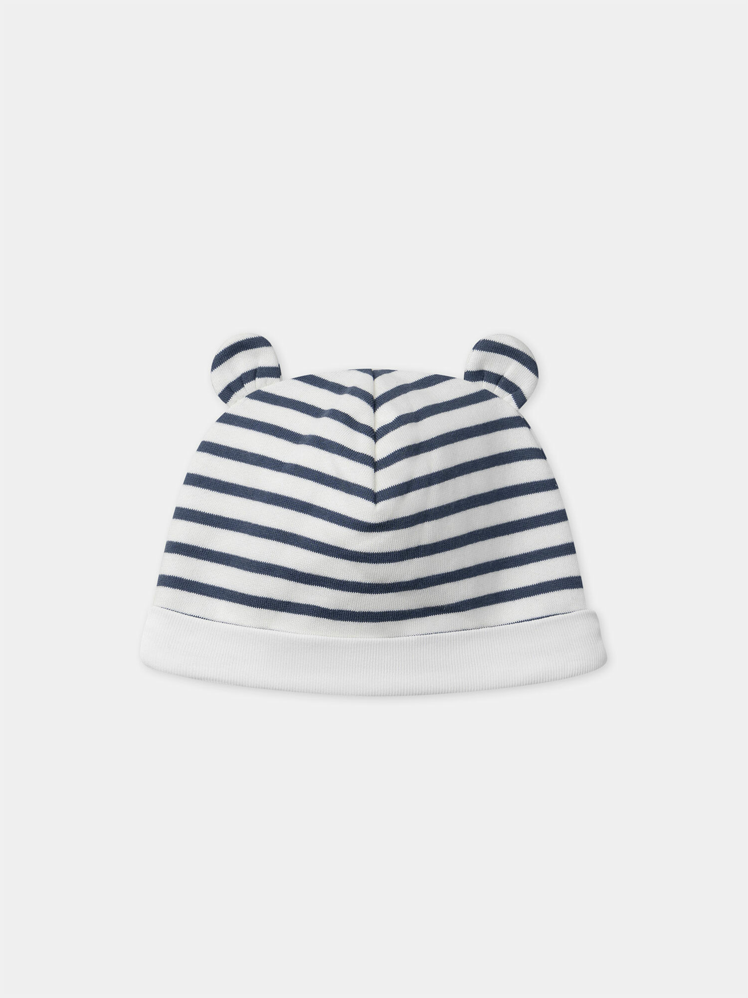 Conçu dans un écru délicat à rayures bleu marine, ce bonnet séduit par son revers côtelé et ses petites oreilles d’animal en 3D, qui éveillent la curiosité et la tendresse. Sa doublure en jersey écru garantit une sensation agréable sur la peau sensible de bébé, tandis que le tour de tête élastiqué assure un maintien parfait sans serrer.