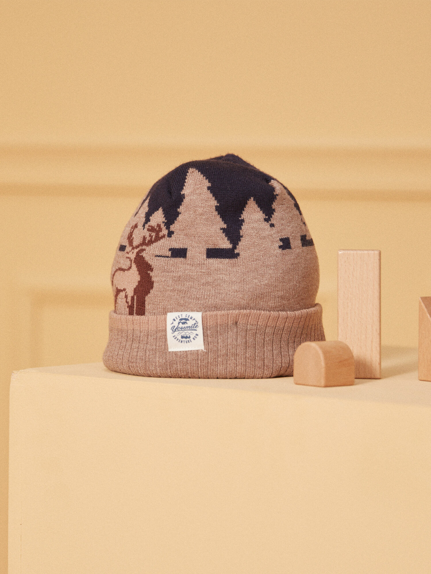 Bonnet tricot jacquard marron avec motif paysage forêt et cerfs. Étiquette tissée sur le revers. Doublure intérieure en matière fine polaire pour une isolation thermique optimale. Produit issu de la collection Manteaux, Vestes & Parkas.