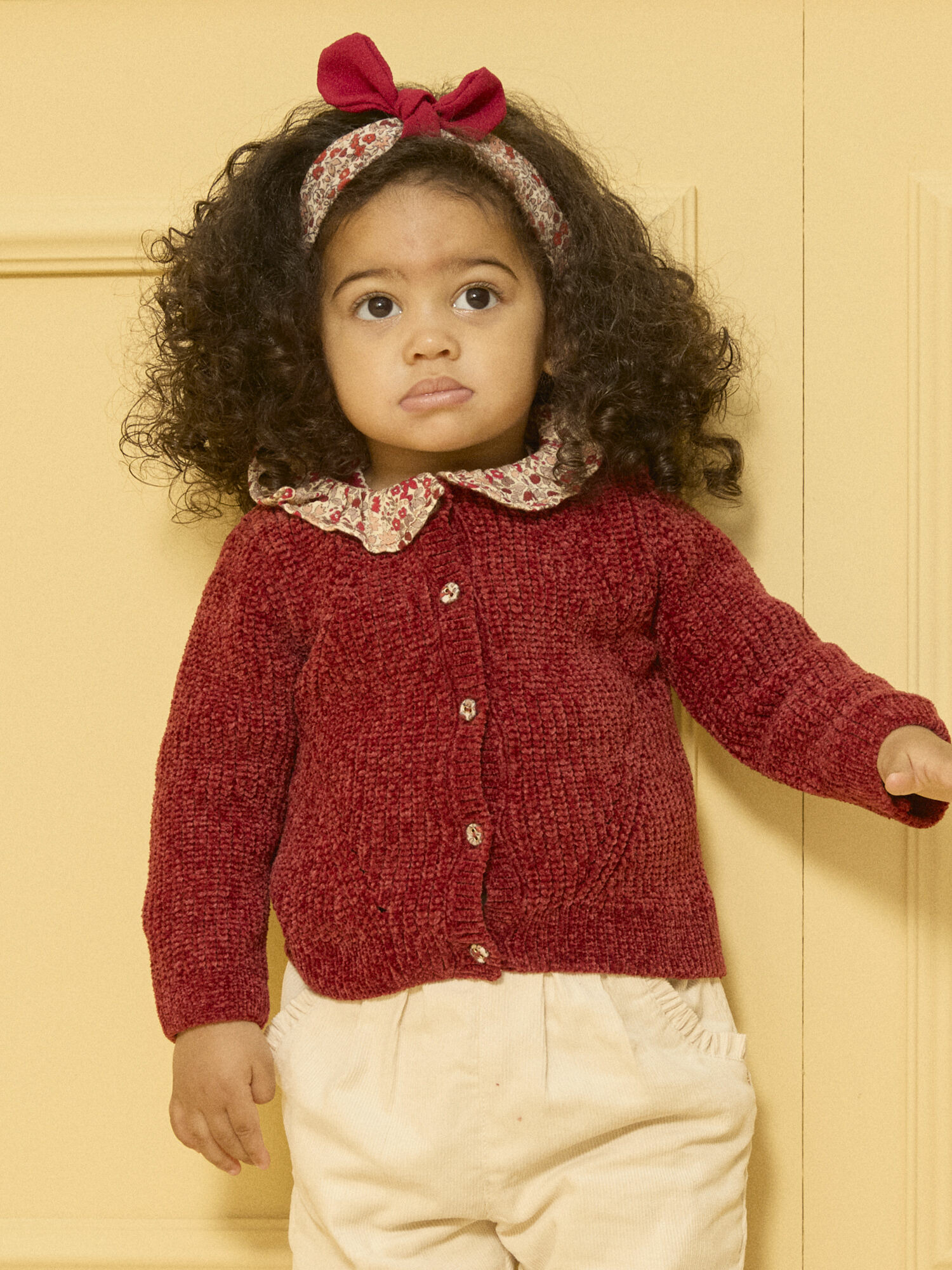 Confectionné dans une maille chenille chaleureuse, ce cardigan se distingue par son col en double gaze de coton imprimé fleuri aux nuances de rouge coquelicot, rouge foncé, corail et beige sur fond écru. L’ouverture avant intégrale, agrémentée de boutons assortis imprimés du même motif floral, facilite l’habillage tout en apportant une touche raffinée à votre tenue. Ce modèle fait partie de la collection Fruit confit à Varsovie, une invitation à la douceur et à la couleur.