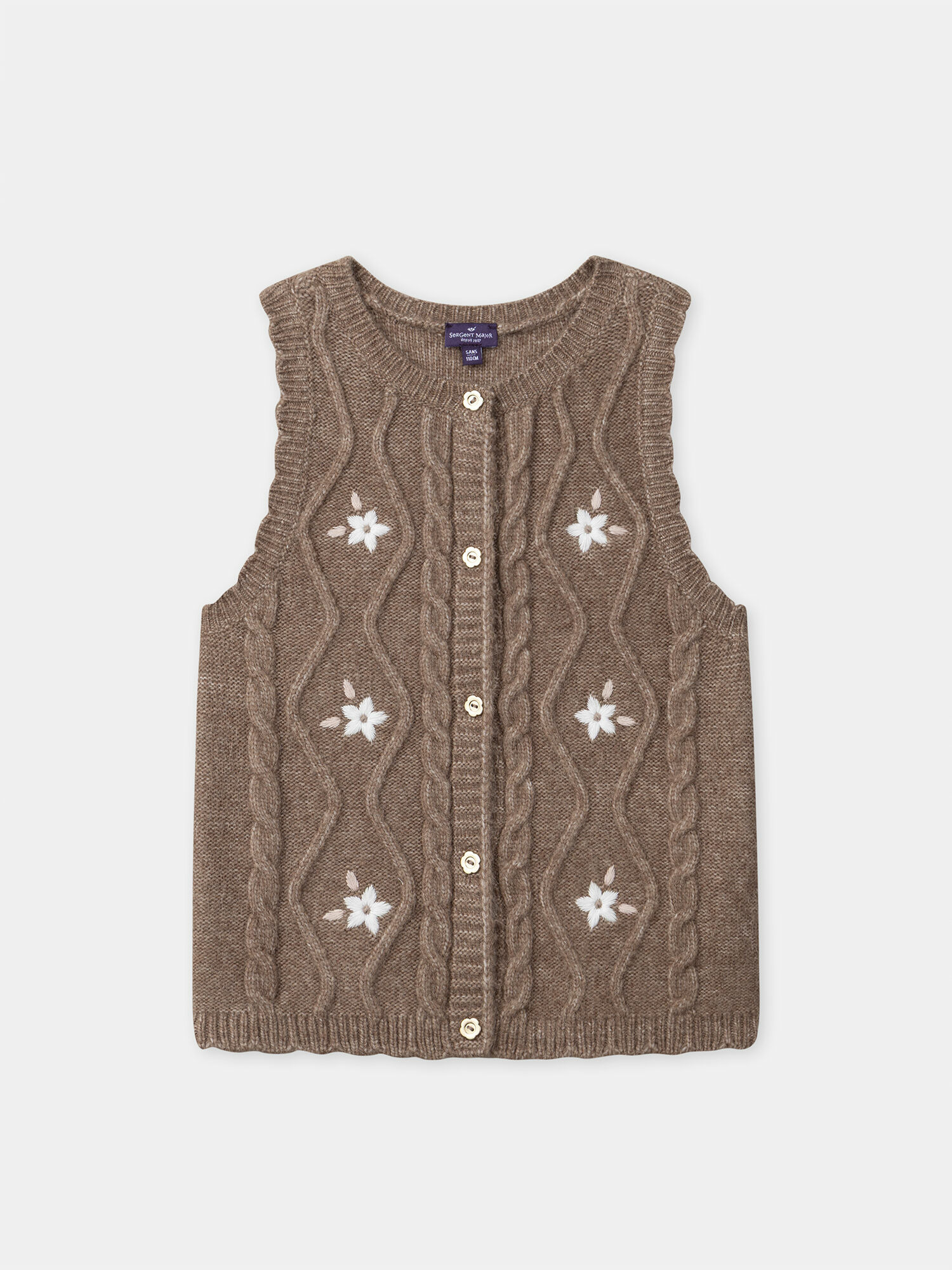 Ce cardigan marron sans manches allie douceur et élégance pour accompagner les petites filles avec délicatesse lors des saisons fraîches. Ses broderies florales et ses finitions en coquilles apportent une touche raffinée qui sublime chaque tenue.