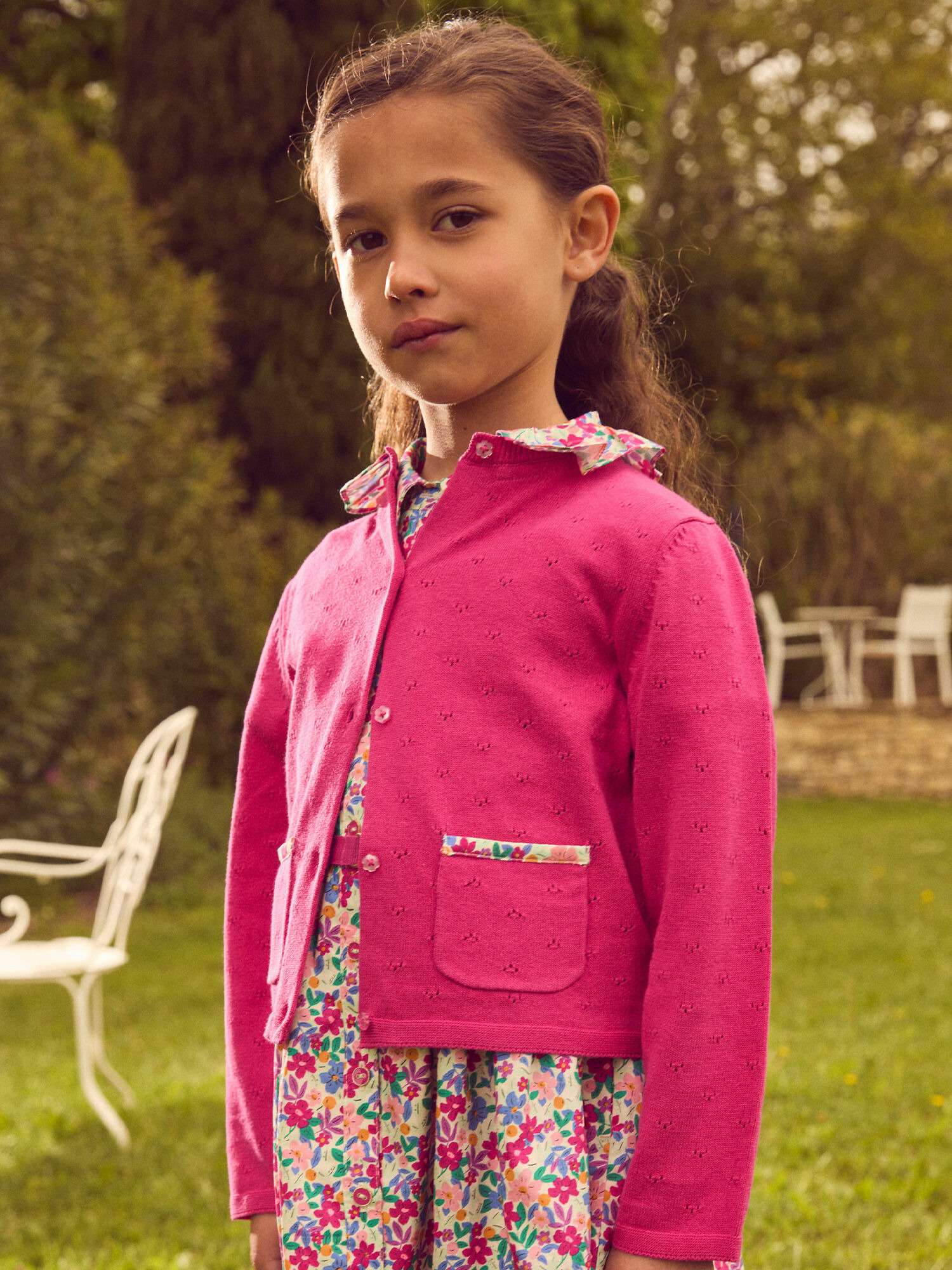 Pour les petites filles qui aiment la couleur et la douceur, ce cardigan rose fuchsia à col fleuri illumine chaque tenue printanière. Léger et délicat, il apporte une note fraîche et joyeuse aux journées ensoleillées.