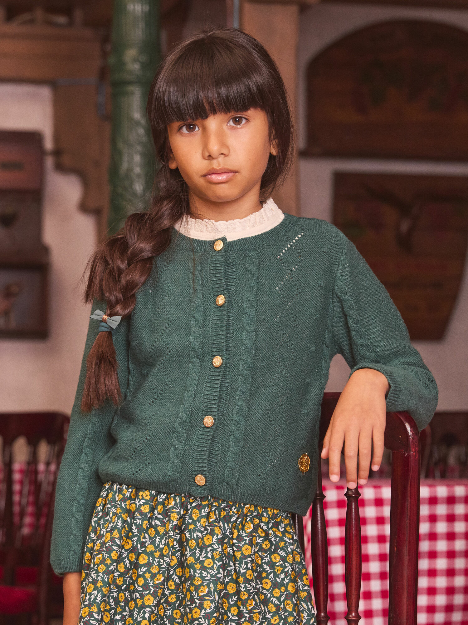 Fabriqué en maille ajourée verte avec torsades décoratives, il présente une décoration dorée au niveau de la poitrine. Ce modèle appartient à la Collection Marmelade à Edimbourg, référence LYCARETTE / 24H2PFO1CARG618, taille 6 ans.