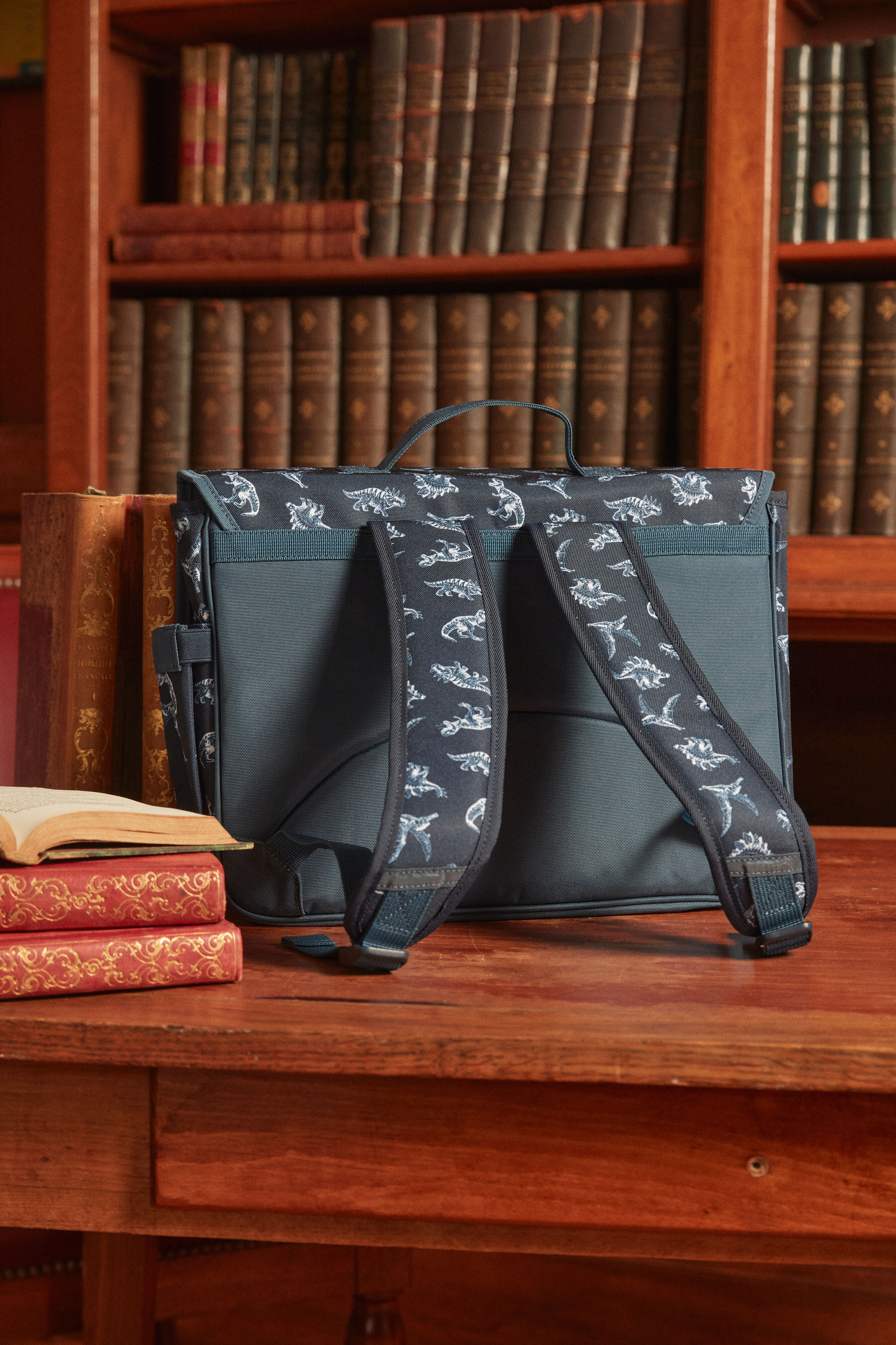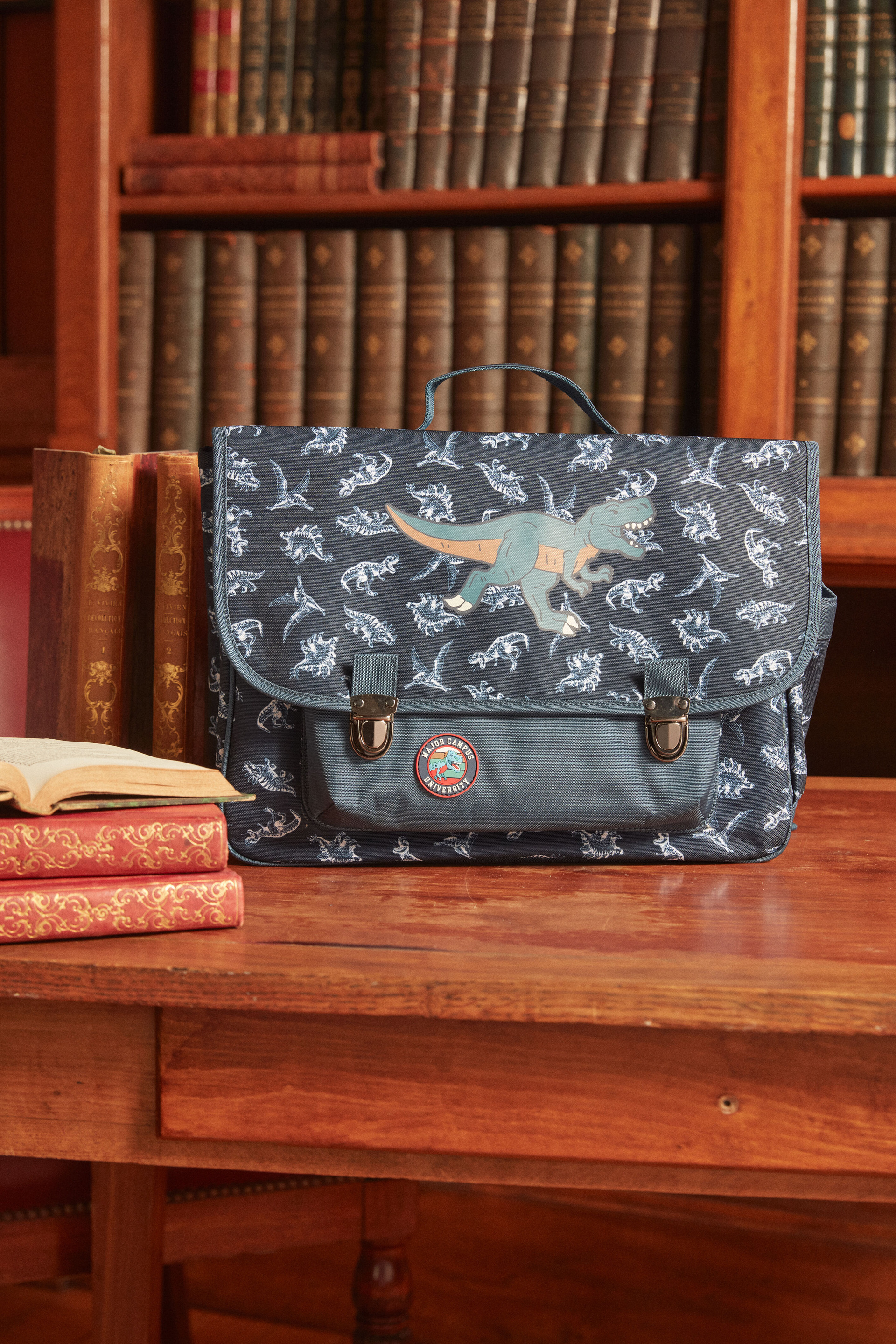 Dimensions 37 x 28 cm. Cartable marine imprimé dinosaures avec grand dinosaure sur le rabat. Badge sur la poche avant, poche supplémentaire à l’avant. Deux compartiments intérieurs. Bretelles ajustables pour un confort personnalisé. Produit issu de la Collection Caramel à Londres. Référence : LICARTAGE / 24H4PGK2BESC205.