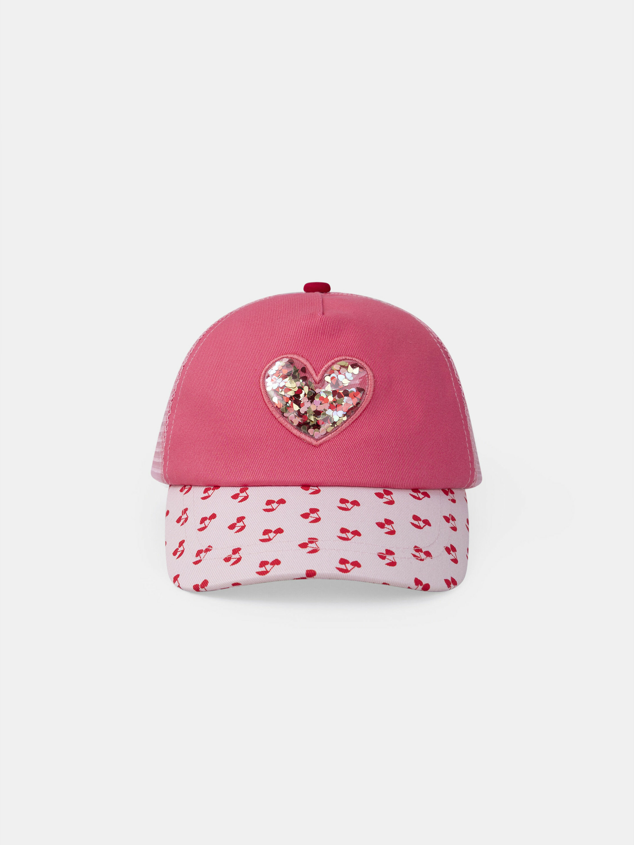 Véritable concentré de détails pratiques, elle présente une visière imprimée cerises rouges sur fond rose pâle, un cœur transparent orné de sequins sur le devant, un scratch réglable à l’arrière et un filet respirant pour un confort durable. Ce modèle fait partie de la collection Bouquet de Cerises, gage de qualité et d’originalité.
