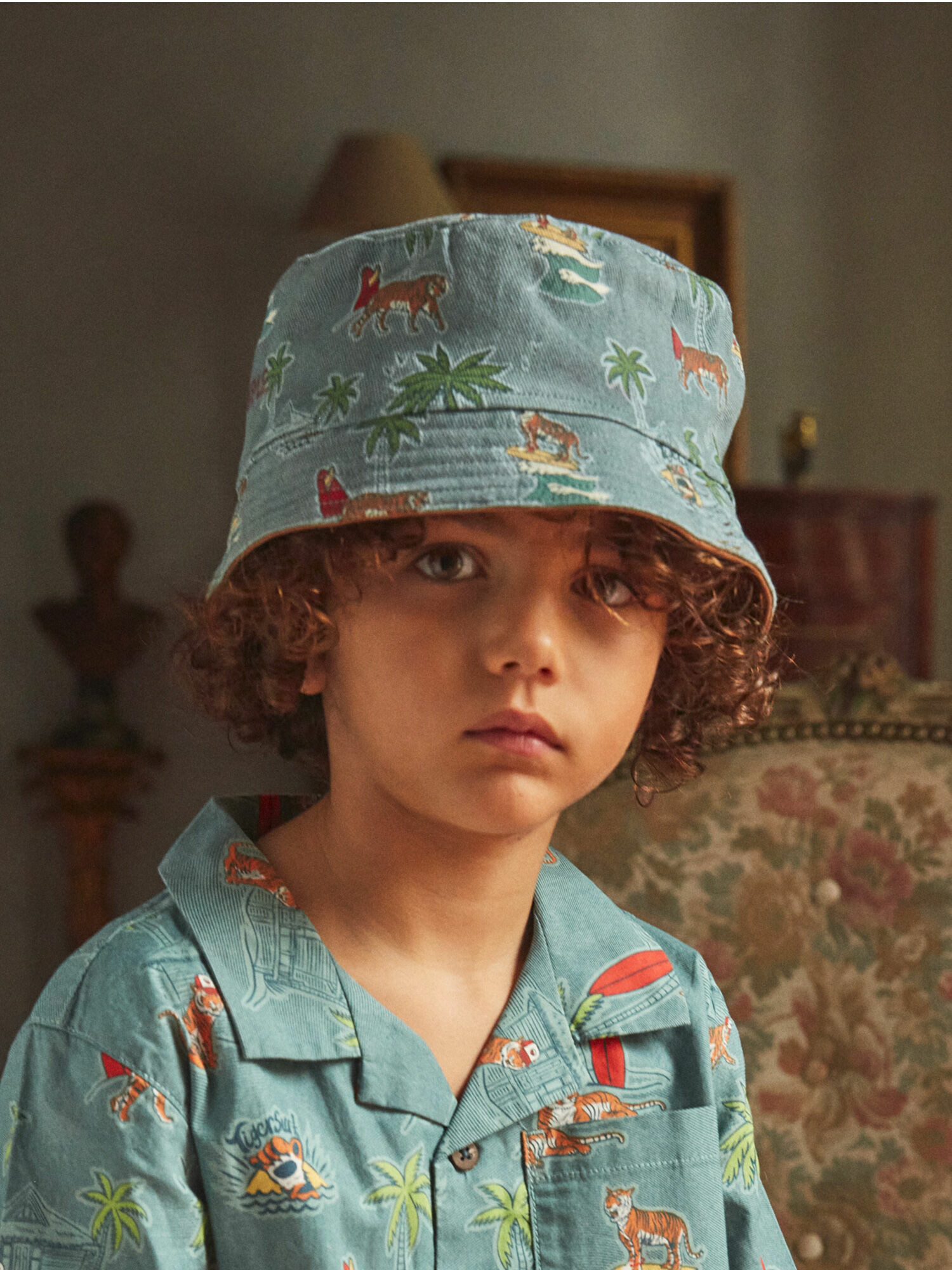 Confectionné en seersucker léger, ce bob joue sur un contraste saisissant : un côté rouille uni orné d’un écusson Tiger surf, l’autre côté dévoile un imprimé bleu et vert vibrant, mêlant palmiers, îles et tigres. Facile à retourner, il permet à votre enfant de choisir son style en toute autonomie, pour une touche décontractée et tendance à chaque sortie.