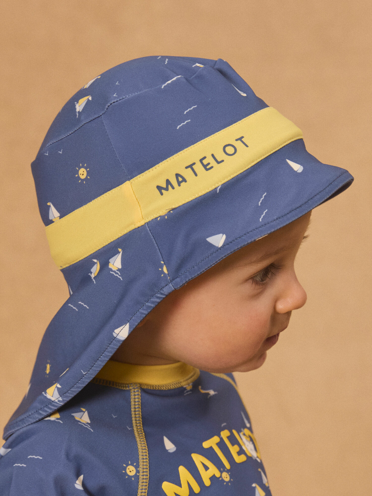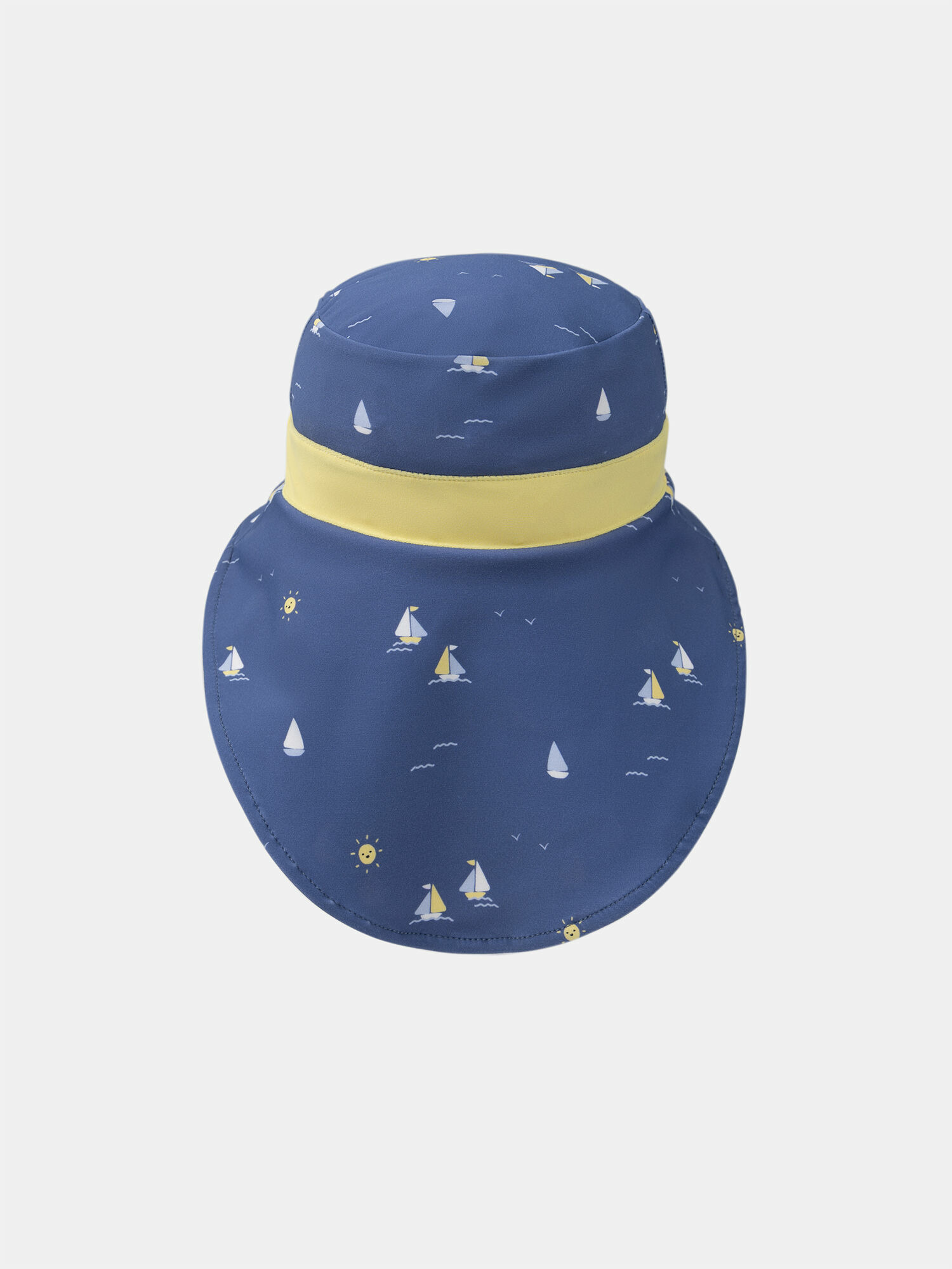 Protégez efficacement la nuque de votre enfant avec style grâce à ce chapeau Sergent Major au motif voiliers sur fond bleu foncé. Son bandeau jaune vif imprimé "matelot" apporte une touche marine irrésistible, parfaitement assortie au t-shirt MISAM.
