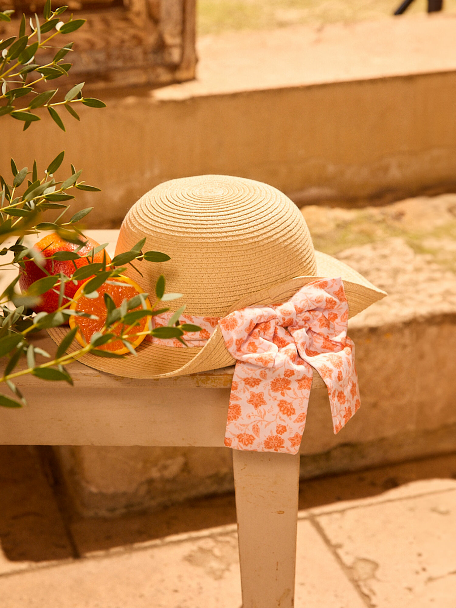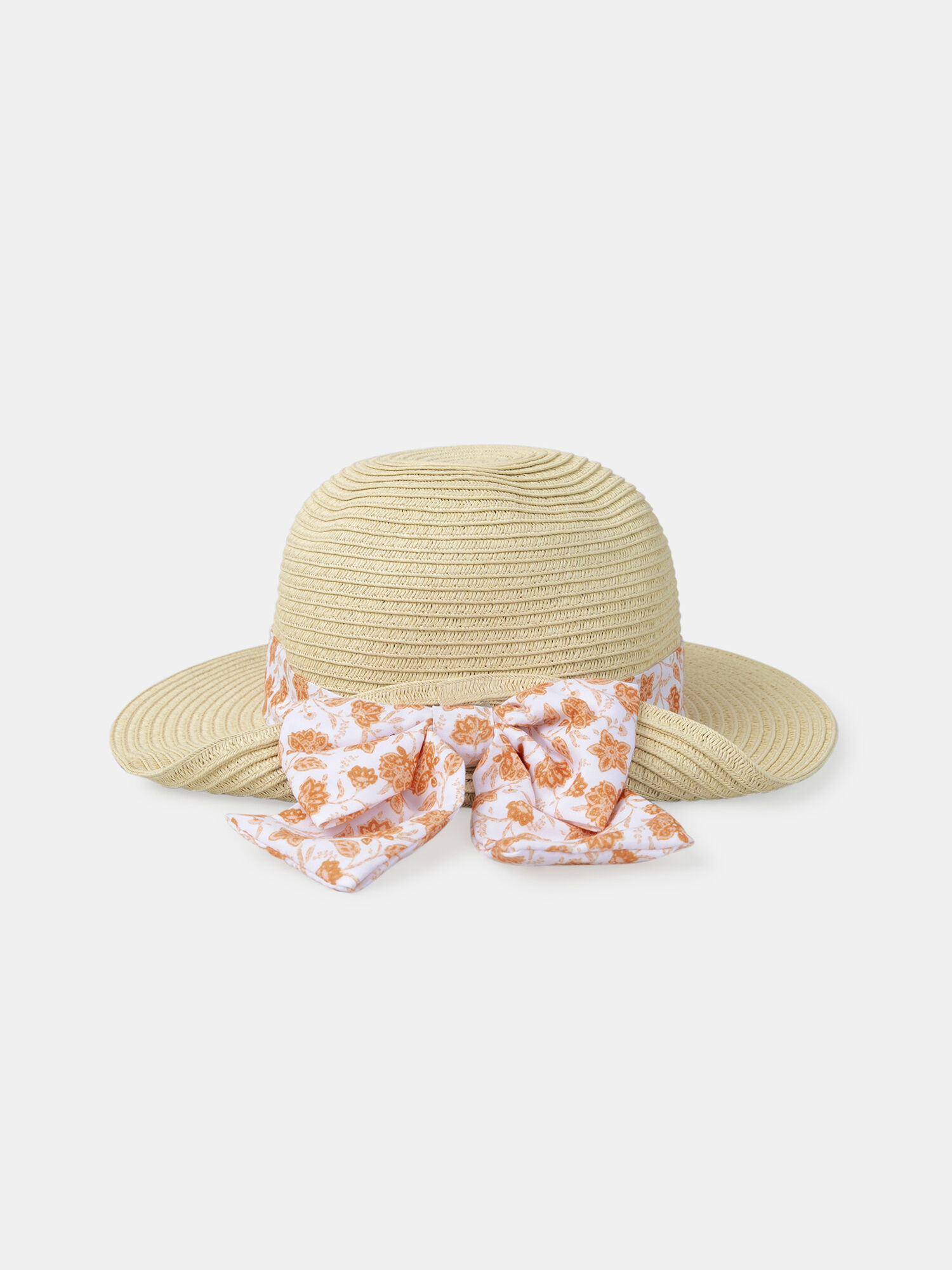 Fabriqué en paille légère, il est orné d’un ruban imprimé fleuri orangé avec un nœud à l’arrière. Ce modèle fait partie de la collection Ecorce D’orange, qui valorise des qualités environnementales accessibles via la fiche produit dédiée.