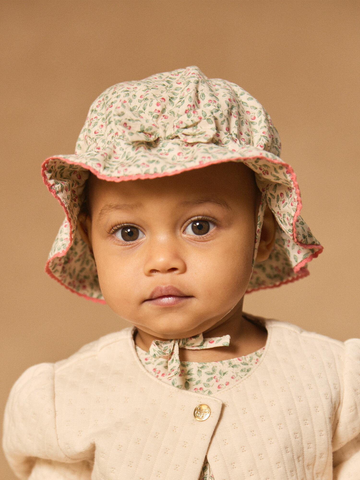 Offrez à votre enfant une protection élégante avec ce chapeau imprimé à volants signé Sergent Major. Son motif baies délicat et sa finition en broderie corail apportent fraîcheur et douceur à chaque sortie.