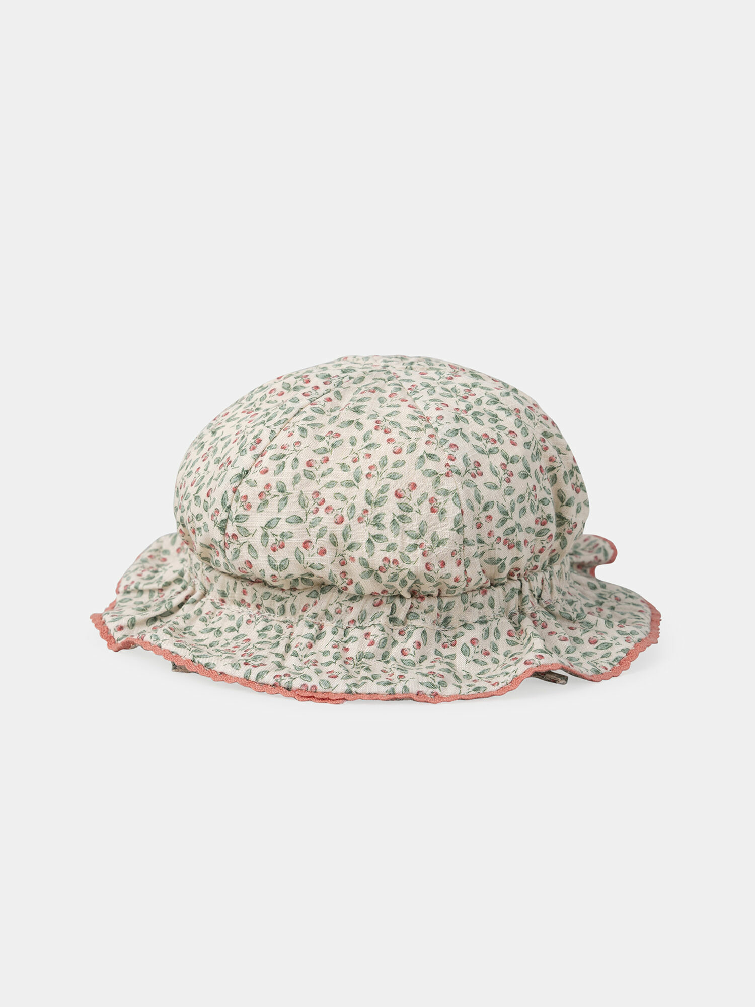 100 % coton imprimé baies sur fond blanc cassé, finition volant broderie corail foncé. Lien à nouer sous le menton pour un maintien confortable. Produit issu de la collection Brin de sauge. Pour plus d’informations sur ses qualités environnementales, consultez la fiche produit dédiée.