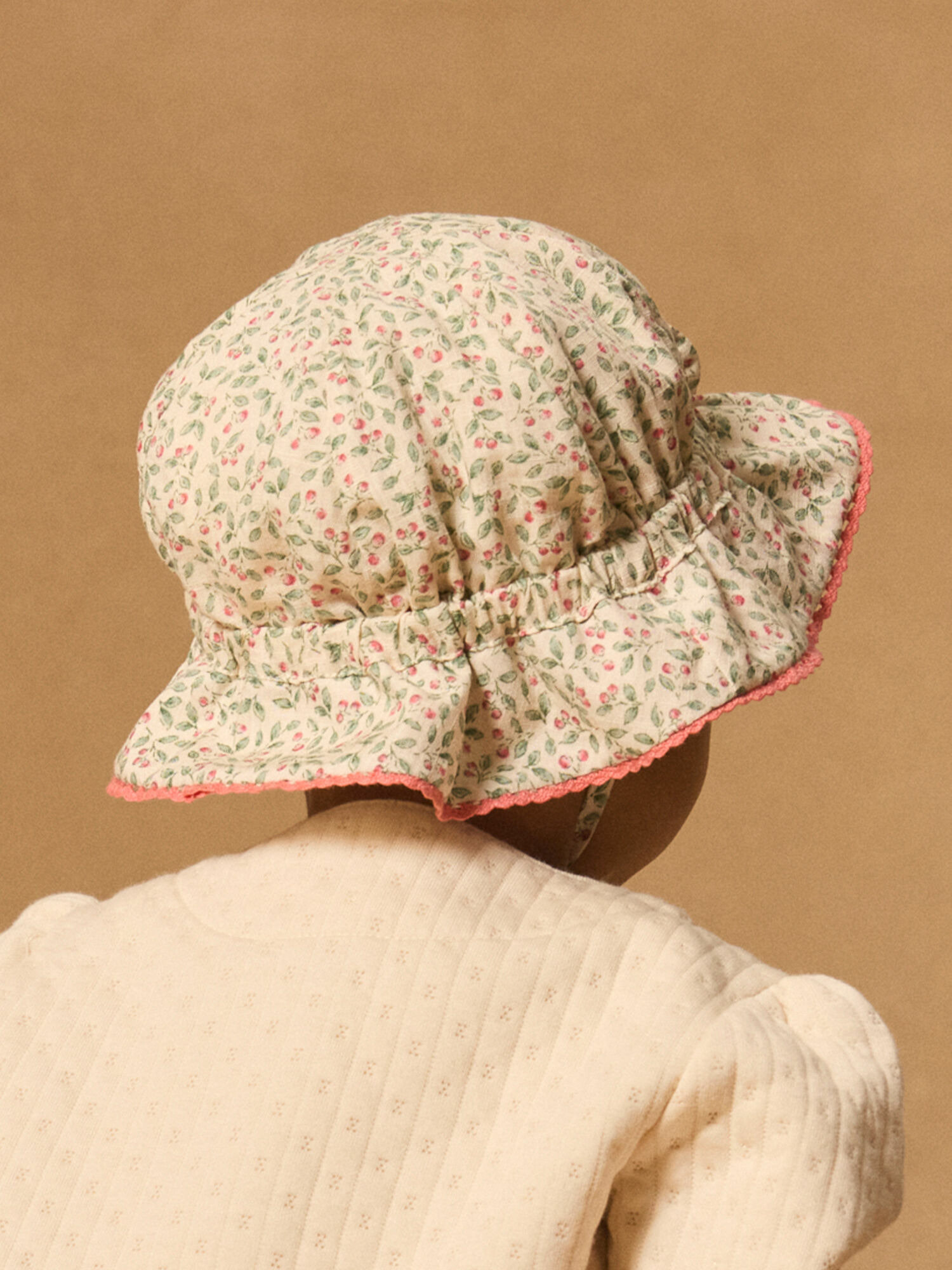 Confectionné en coton léger, ce chapeau allie confort et style naturel. Le fond blanc cassé met en valeur l’imprimé baies tandis que le volant brodé souligne la finesse du design. Pratique, il se maintient parfaitement grâce à un lien à nouer sous le menton, garantissant un ajustement sécurisé sans compromis sur la liberté de mouvement.