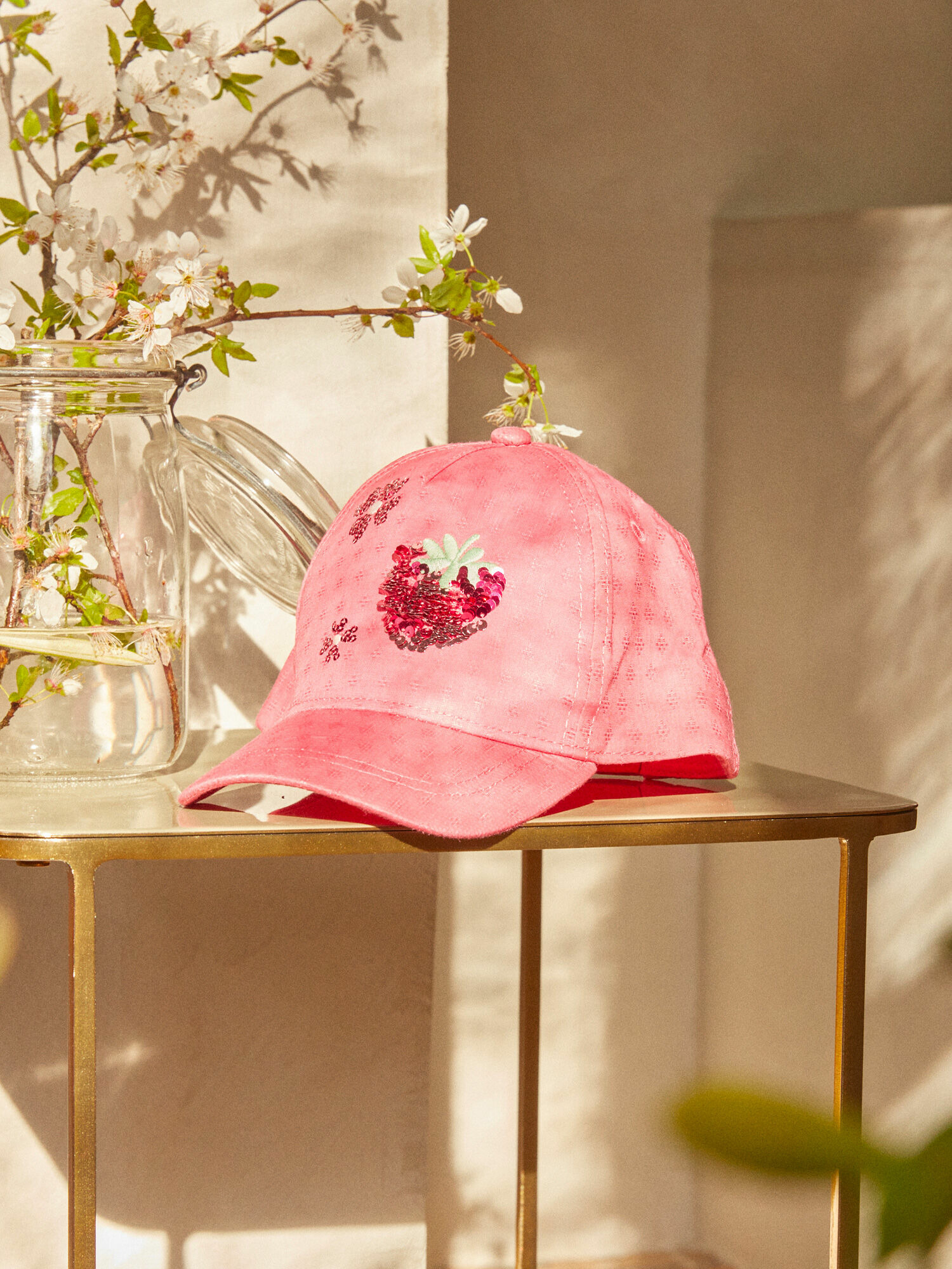 Casquette rose en coton avec fraise en sequins à l’avant. Visière arrondie pour une protection solaire efficace. Bande de réglage à scratch à l’arrière pour un ajustement personnalisé. Produit issu de la Collection Une Virée dans les Alpes.