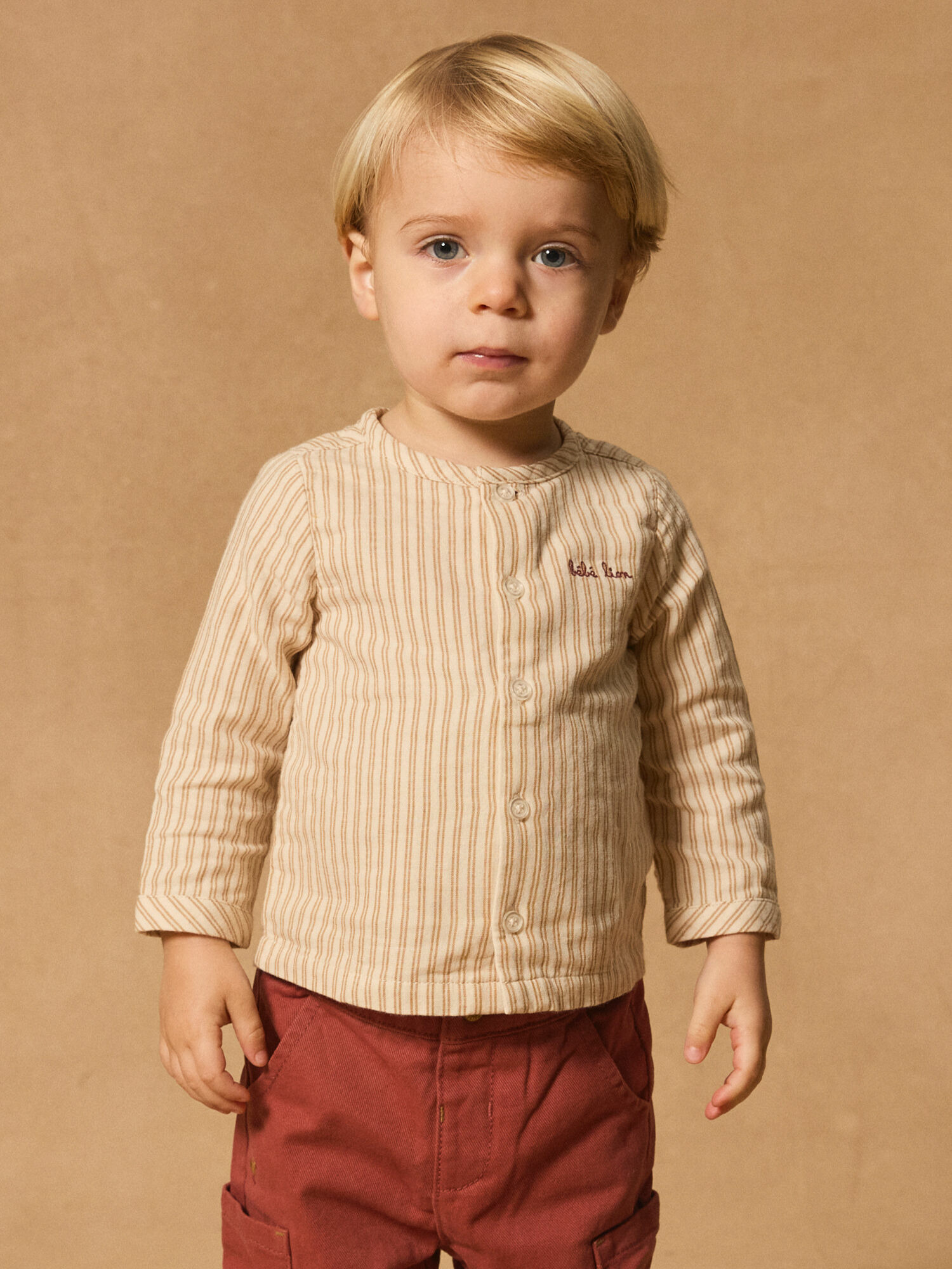 Chemise col mao rayée avec rayures marron camel sur fond vanille. Broderie bébé lion sur le buste. Ouverture avant intégrale par boutons pour un habillage facile. Référence produit : MAAMIR / 25E1BG71CHM114. Ce produit fait partie de la Terre de Chardons, programme engagé pour des qualités environnementales visibles via la fiche produit dédiée.