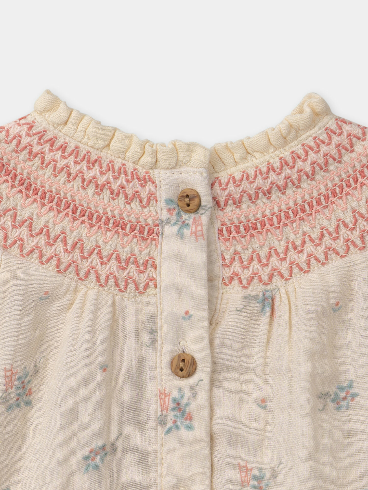 Imprimé fleuri et souris dans des tons gris, corail foncé et vert sur fond blanc cassé. Smocks sur le col en corail foncé, rose fluo et rose pâle. Ouverture dos intégrale par boutons en bois. Poignets élastiqués. Produit issu de la collection Brin de sauge.