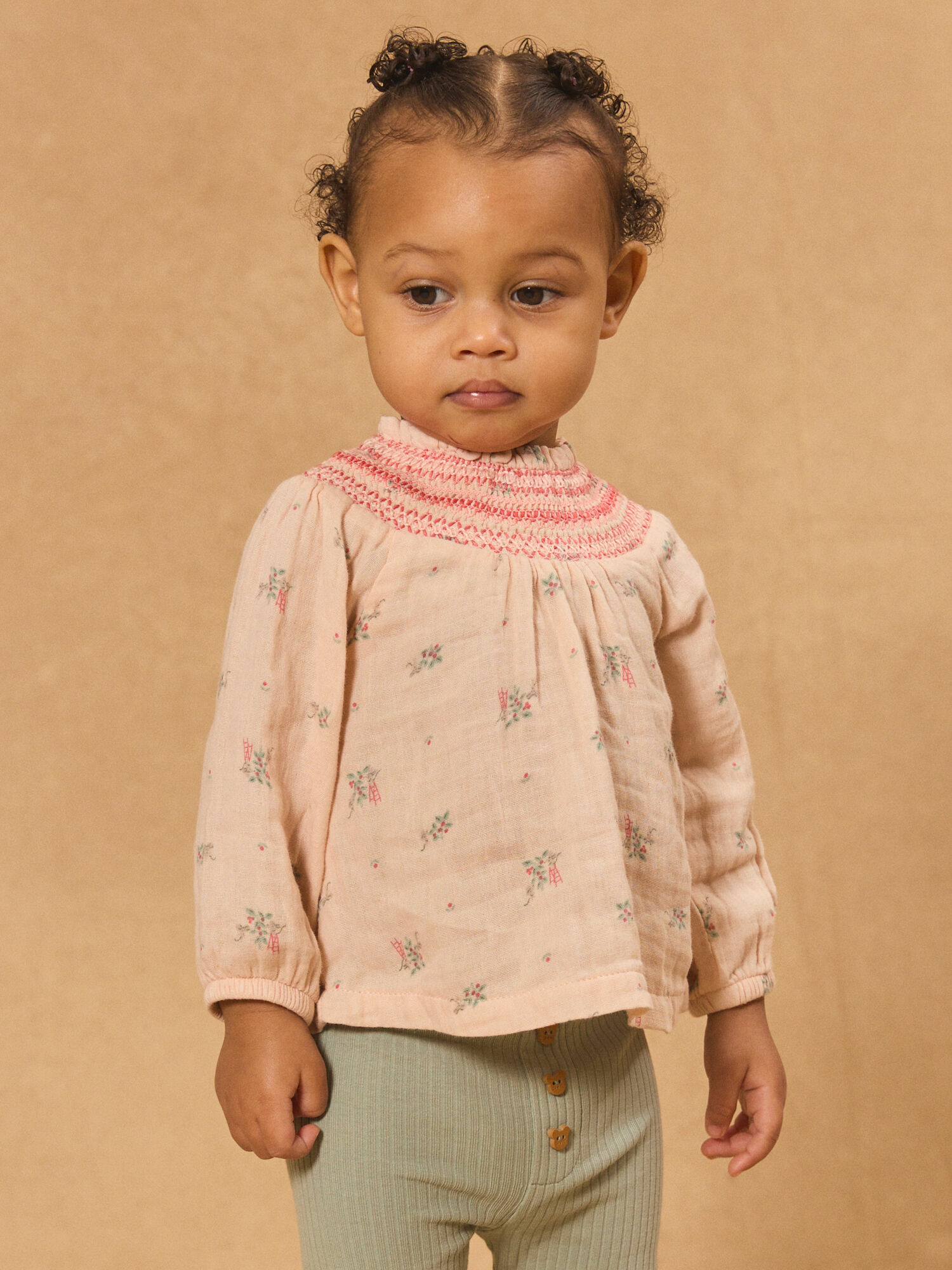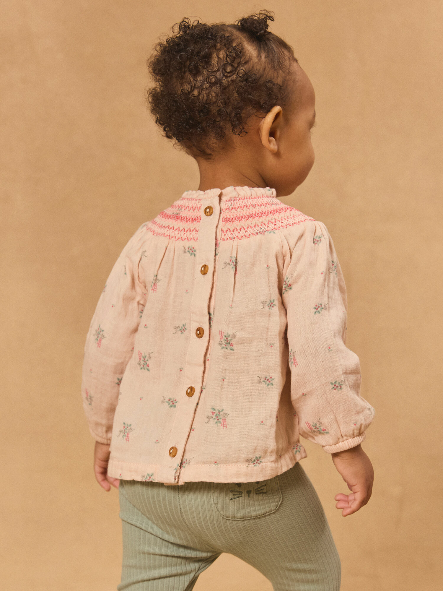 Apportez une touche fraîche et ludique à la garde-robe de votre enfant avec ce chemisier à smock imprimé fleuri. Son motif délicat mêle fleurs et souris dans des tons doux, parfait pour le printemps.