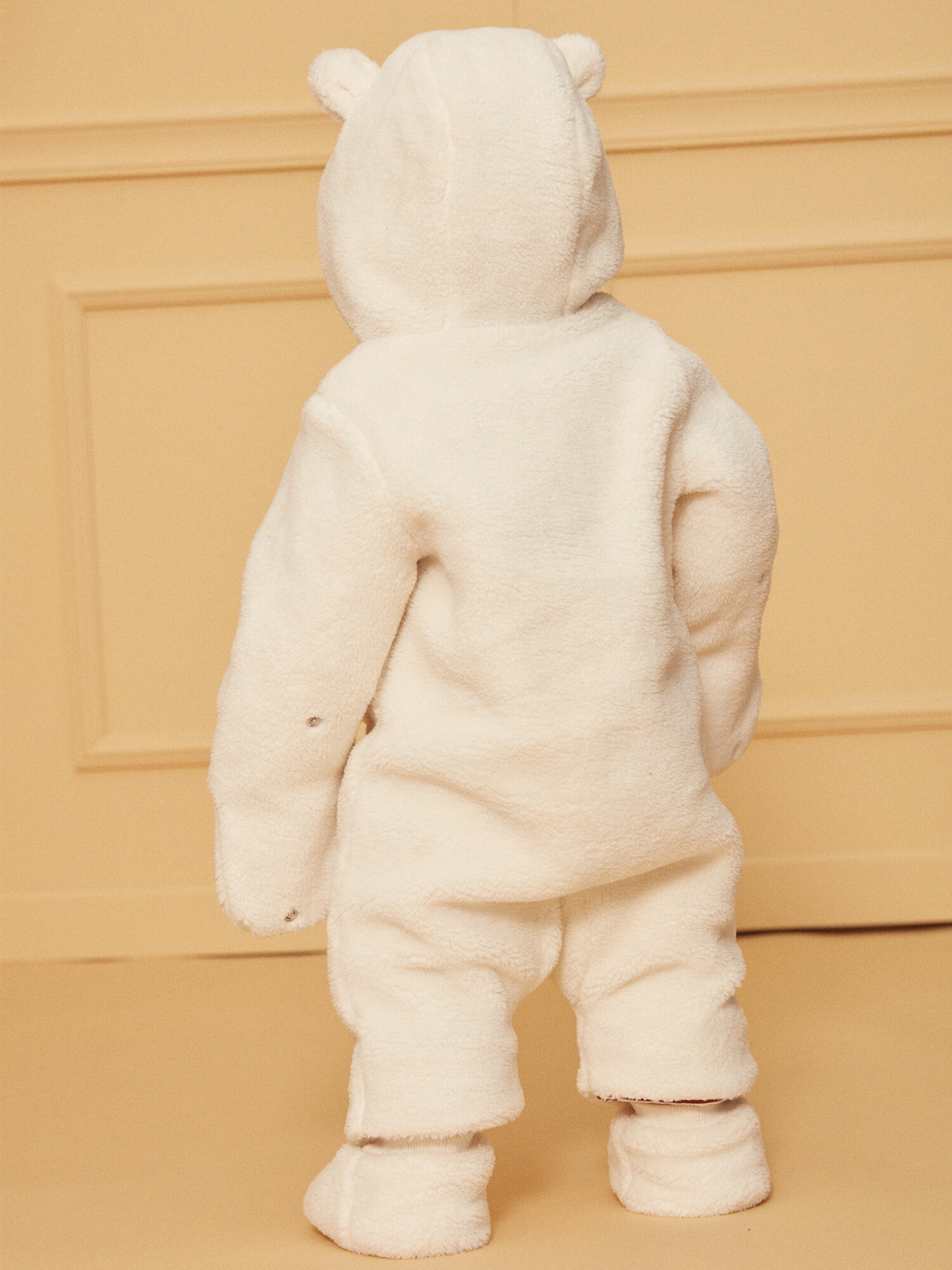 Cette combinaison se distingue par son intérieur rayé marron et écru, apportant une touche chaleureuse et élégante. Sa capuche ornée d’oreilles en 3D ajoute une note ludique et craquante, tandis que l’ouverture avant intégrale, équipée d’une fermeture zippée et de boutons pressions cachés, facilite l’habillage. Pensée pour le quotidien, elle intègre des moufles et pieds pour une protection complète contre le froid.