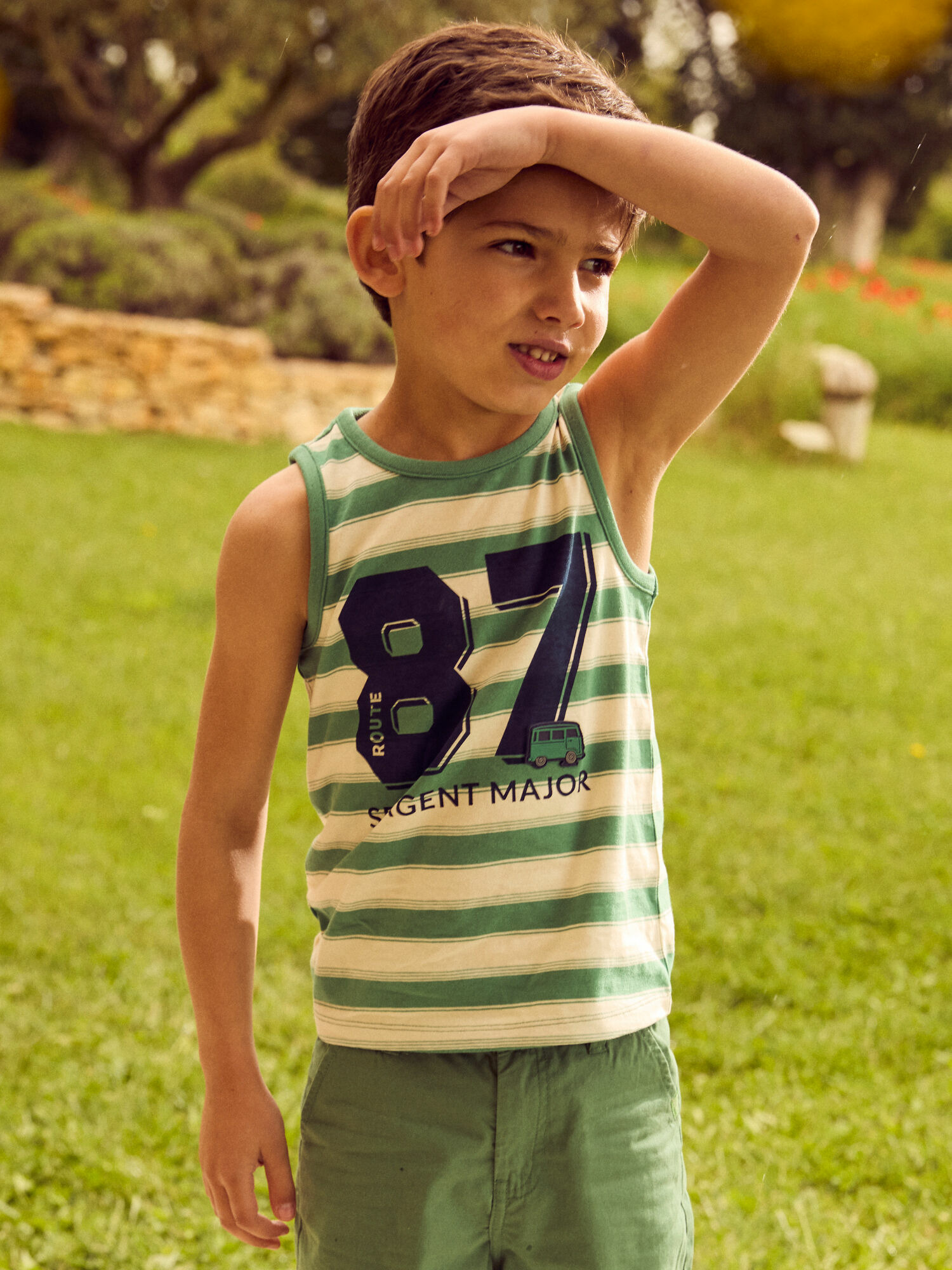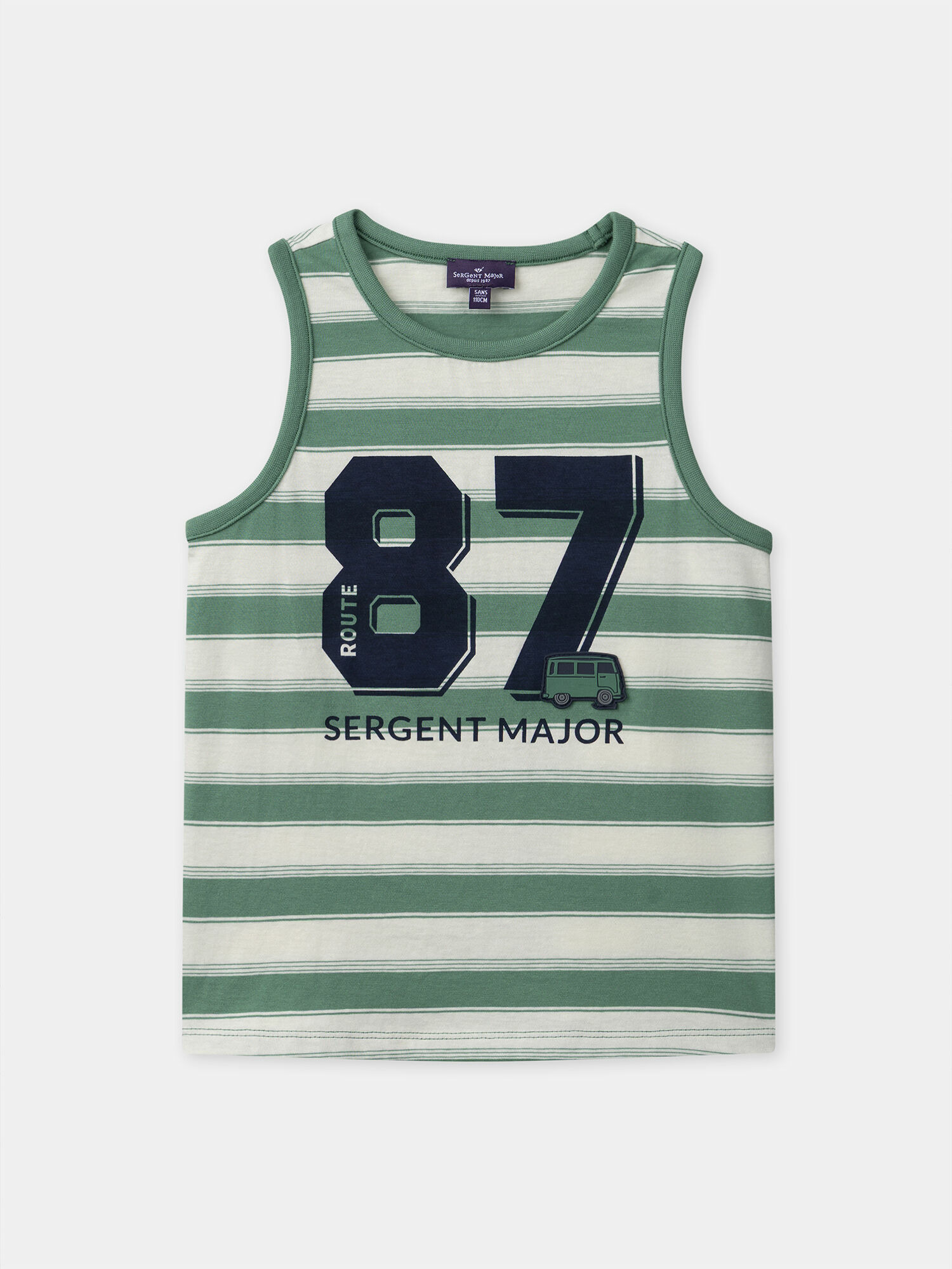 Débardeur en jersey rayé vert, imprimé "97" sur le devant, badge van en relief. Ce modèle fait partie de la collection Goûter au Jardin. Pour découvrir les qualités et caractéristiques environnementales, consultez la fiche produit dédiée.