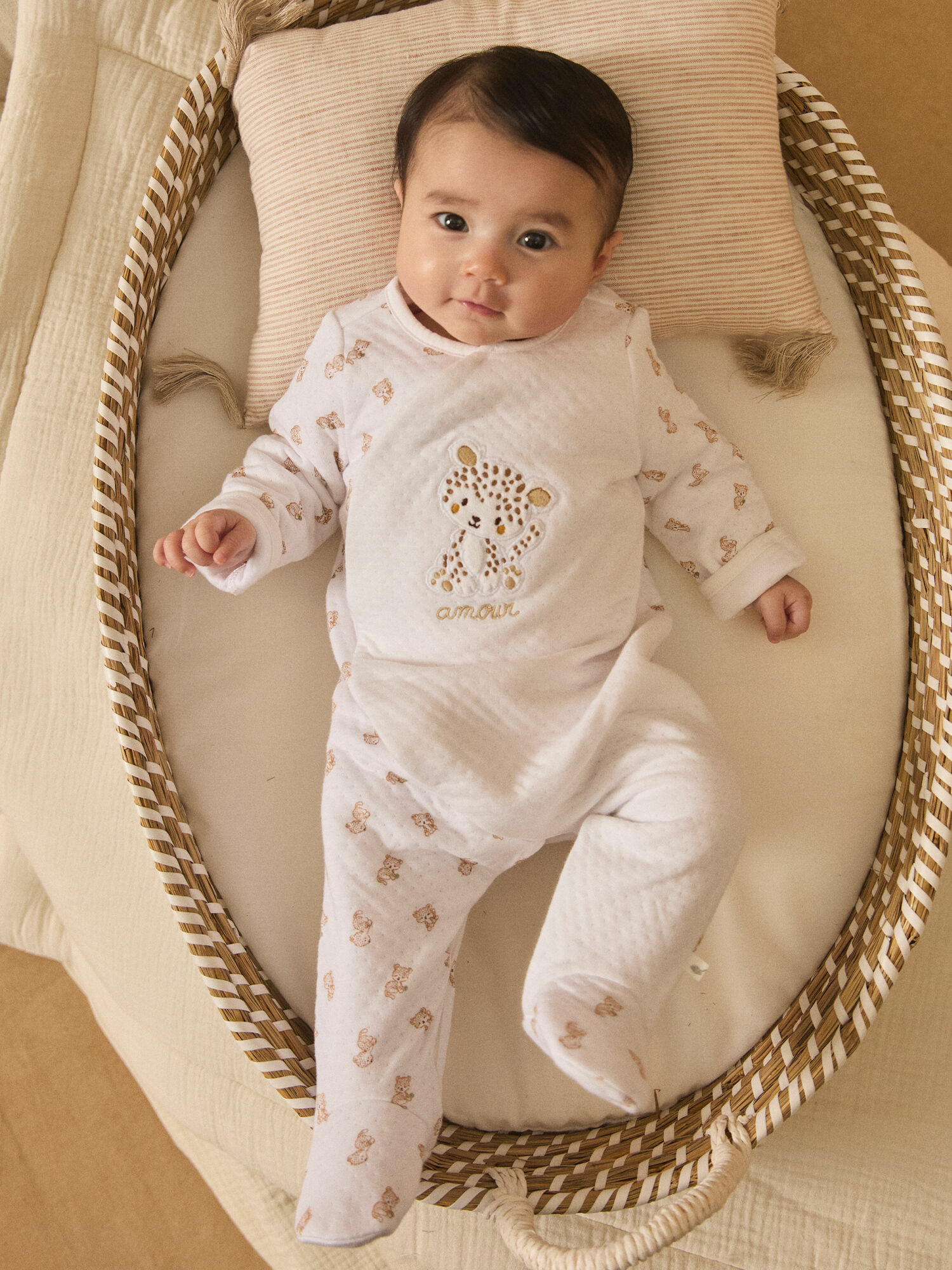 Confectionné en coton issu de l’agriculture biologique, ce dors-bien associe un tubique uni à un imprimé léopard subtil dans des tons noisette, vert amande et écru. Le patch velours léopard sur le buste, rehaussé de finitions brodées et d’une inscription "amour", apporte une touche raffinée et chaleureuse. Sa coupe pratique avec ouverture arrondie à l’avant et boutons pression invisibles facilite l’habillage et le change.