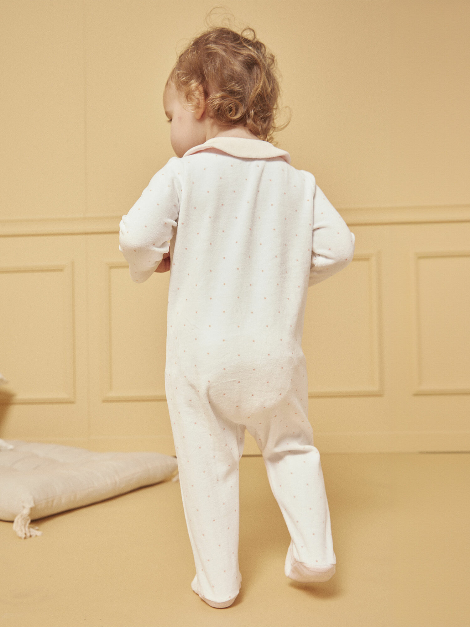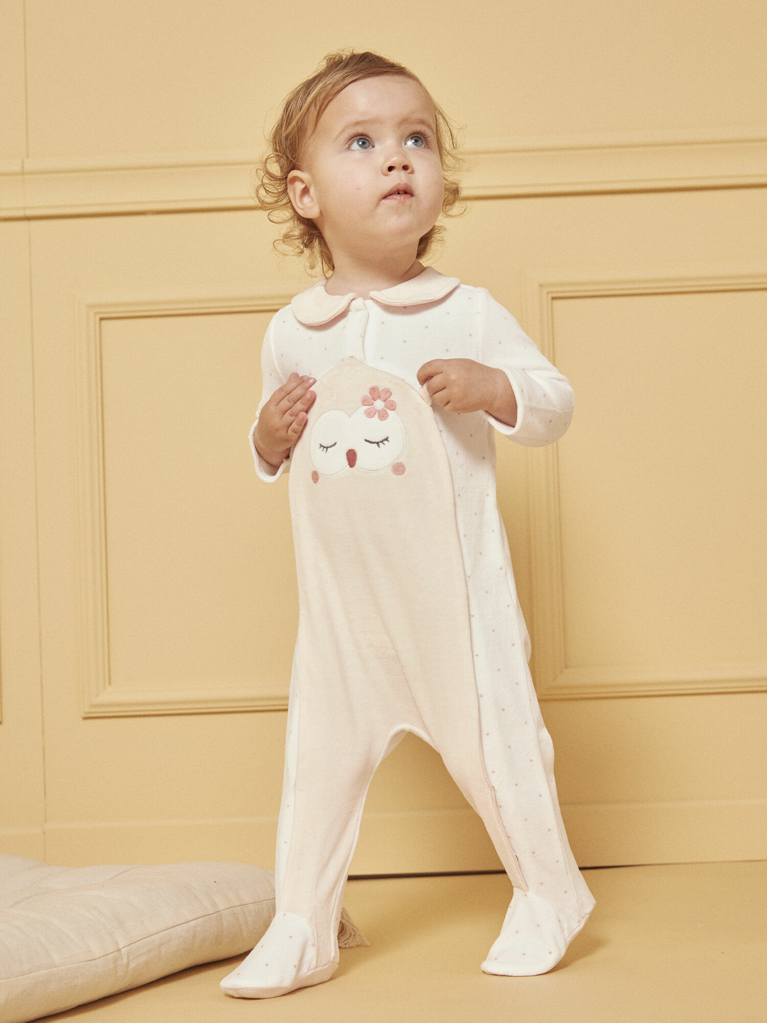 Dors-bien en velours écru à pois rose macaron et velours rose clair uni. Découpe arrondie en velours rose clair avec visage de hibou en patch velours écru. Détails brodés en fils rose macaron, rose ancien et gris. Oreilles de hibou en 3D. Boutons pression invisibles le long de l’ouverture arrondie. Col en velours rose clair doublé en jersey.