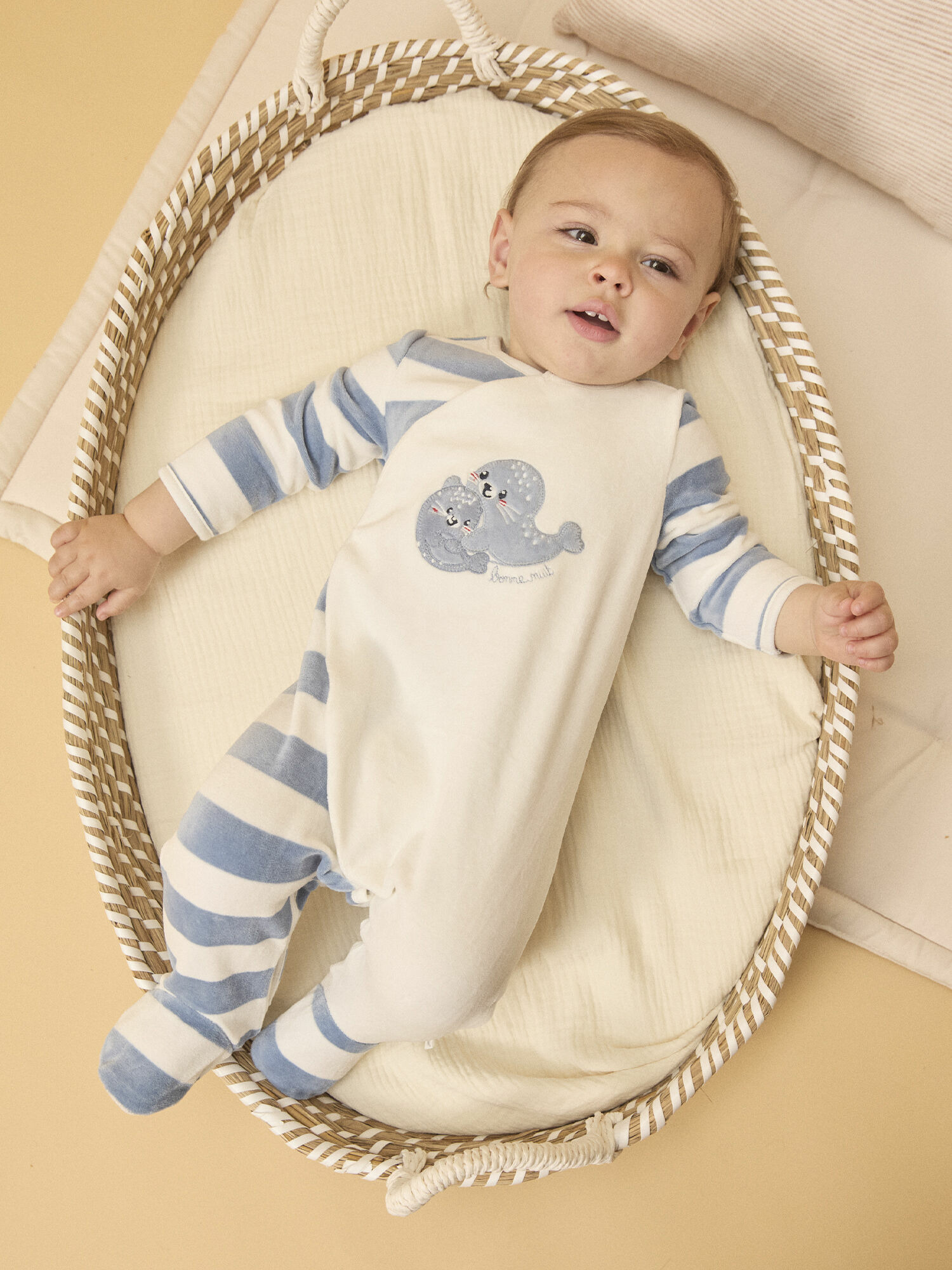Velours doux uni et rayé bleu grisé sur fond écru. Patchs en velours phoques sur le buste, finitions brodées. Inscription "bonne nuit" brodée. Ouverture arrondie avant avec boutons pression invisibles. Étiquette cadeau en forme de phoque. Collection Neige et douceur TR2. Référence LOIG / 24H0NGN1GRE001.