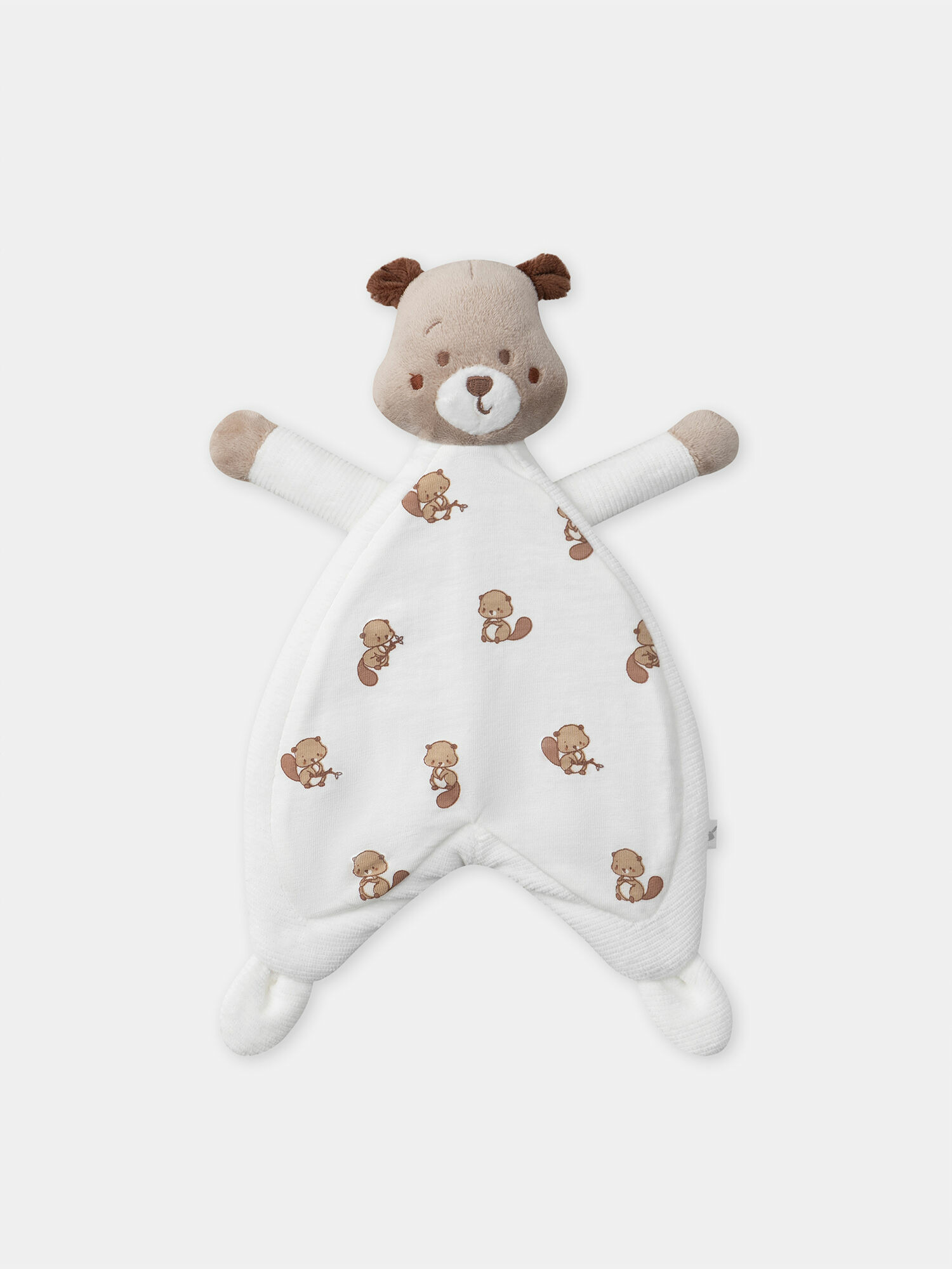Confectionné avec soin, ce doudou de 30 cm présente une tête en fourrure synthétique aux nuances café au lait et chocolat, rehaussée d’un patch écru sur le museau et de détails brodés qui apportent une touche délicate et expressive. Son corps en velours milleraies écru et jersey imprimé de petits castors dans des tons noisette et café au lait crée un contraste subtil et chaleureux, tandis que ses pattes en fourrure synthétique complètent ce rendu naturel et doux au toucher.