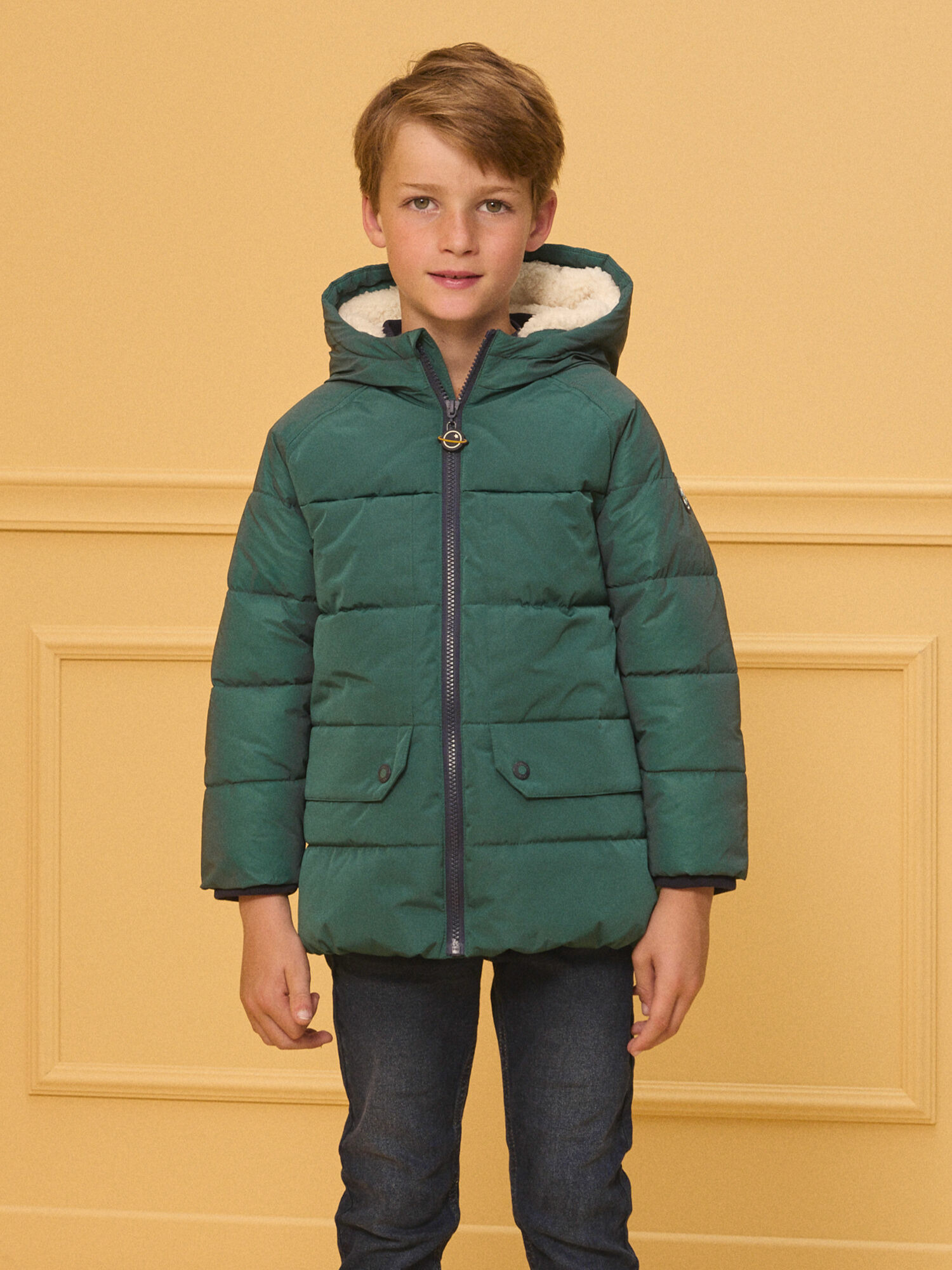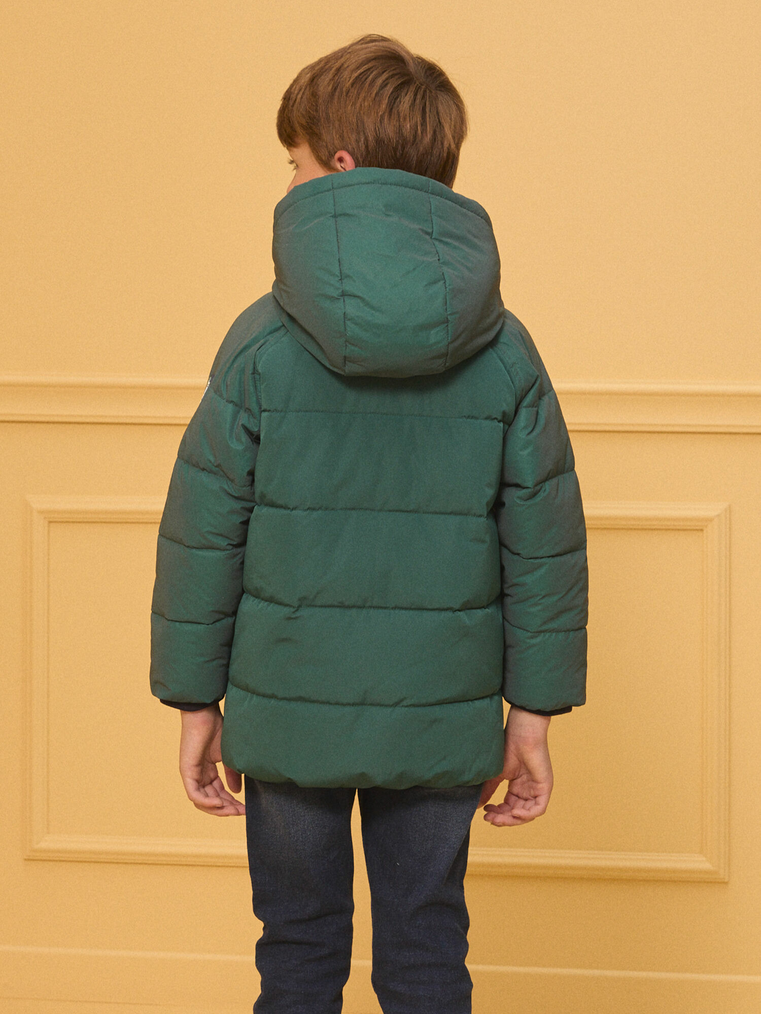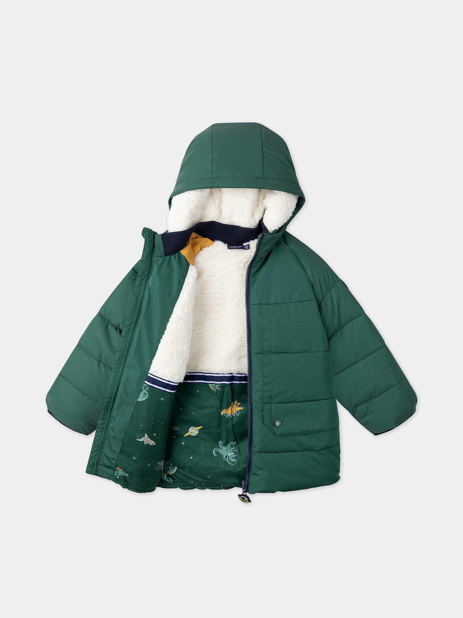 Doudoune longue matelassée verte à capuche, traitement déperlant. Capuche et manches en matière réfléchissante. Doublure bi matière : moumoute sur la moitié supérieure, twill de coton motif dinosaure sur la moitié inférieure. Deux poches à rabat doublées polaire, fermeture pression. Bord côte au col et poignets, boucle pour accrocher les gants. Badge en relief sur la manche. Collection GP3. Référence : LIOGRAGE / 24H3PG82D3EG614.