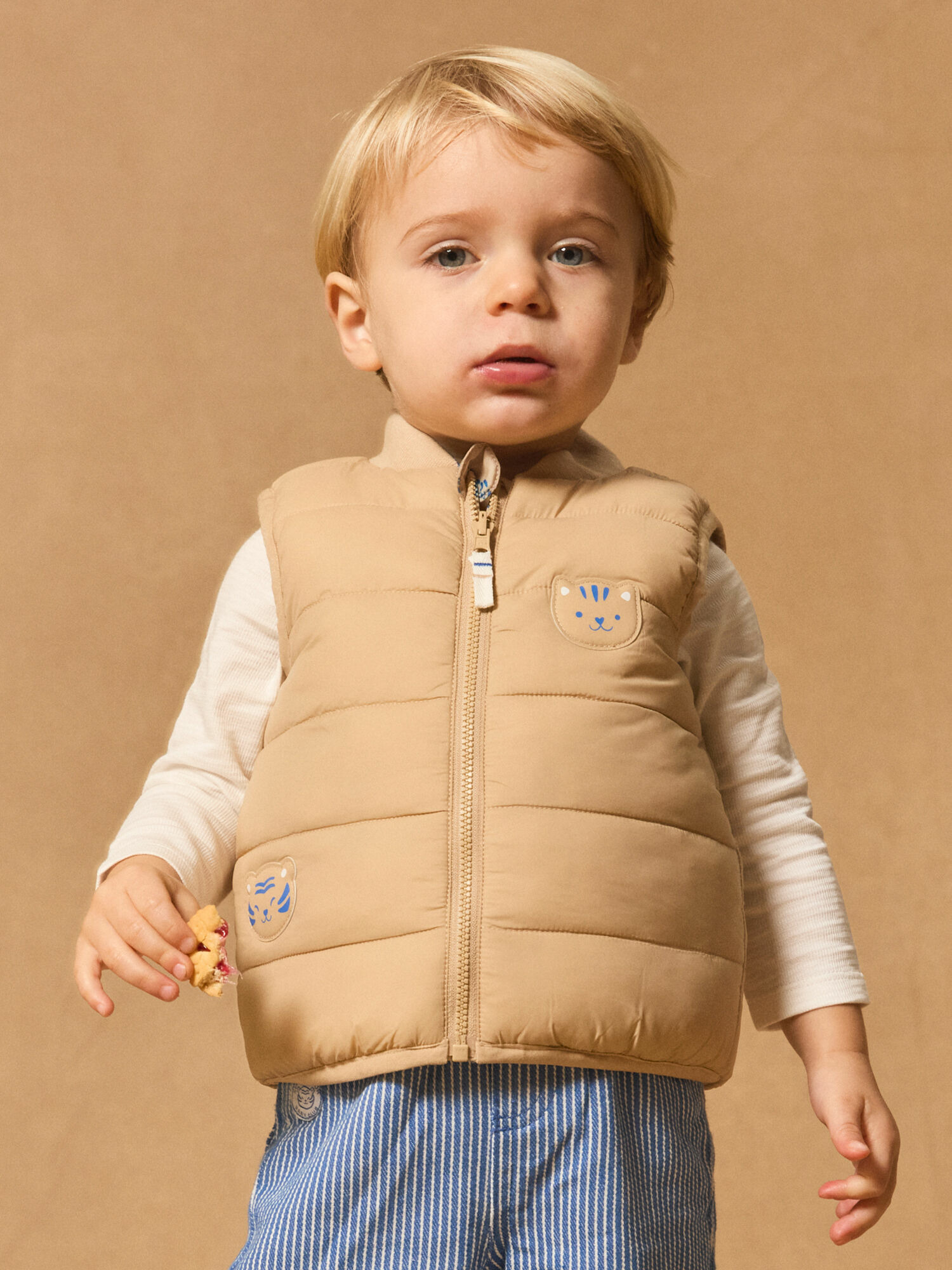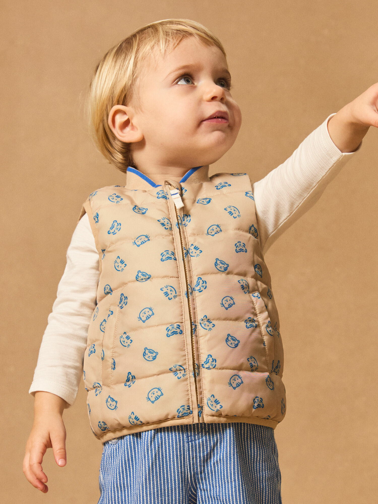 Cette pièce réversible propose deux looks distincts : une face unie beige agrémentée de patches chats pour un style sobre et élégant, et une face imprimée de chats écru sur fond bleu roi, idéale pour un look plus vif et amusant. Les biais contrastés et les rayures écru sur le col apportent une touche soignée, tandis que la coupe matelassée assure chaleur et confort tout au long de la journée.