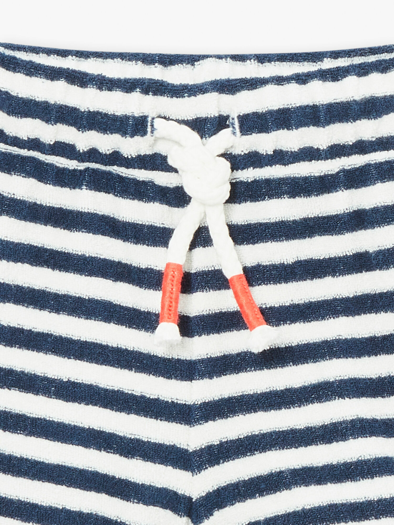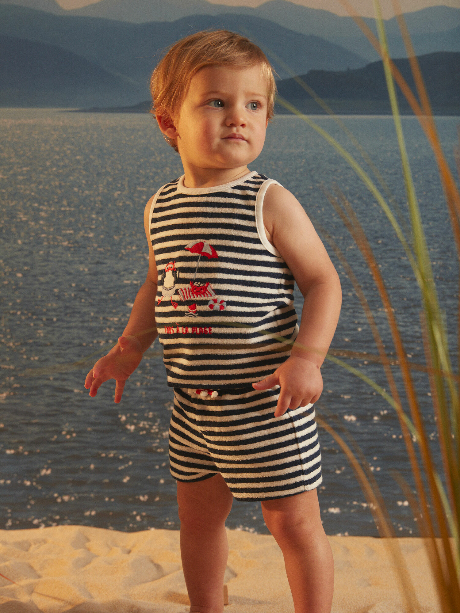 Débardeur sans manches à col rond, short à taille élastiquée avec cordon de serrage, patchs brodés mouette et crabe sur le devant, ouverture au dos pour un enfilage facile. Ensemble rayé bleu marine, référence KISANN / 24E1BGG1ENS070. Pour découvrir les qualités environnementales de ce produit, consultez la fiche dédiée en cliquant ICI.
