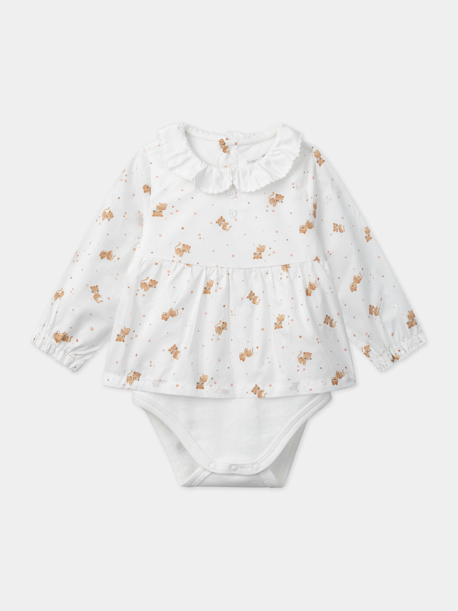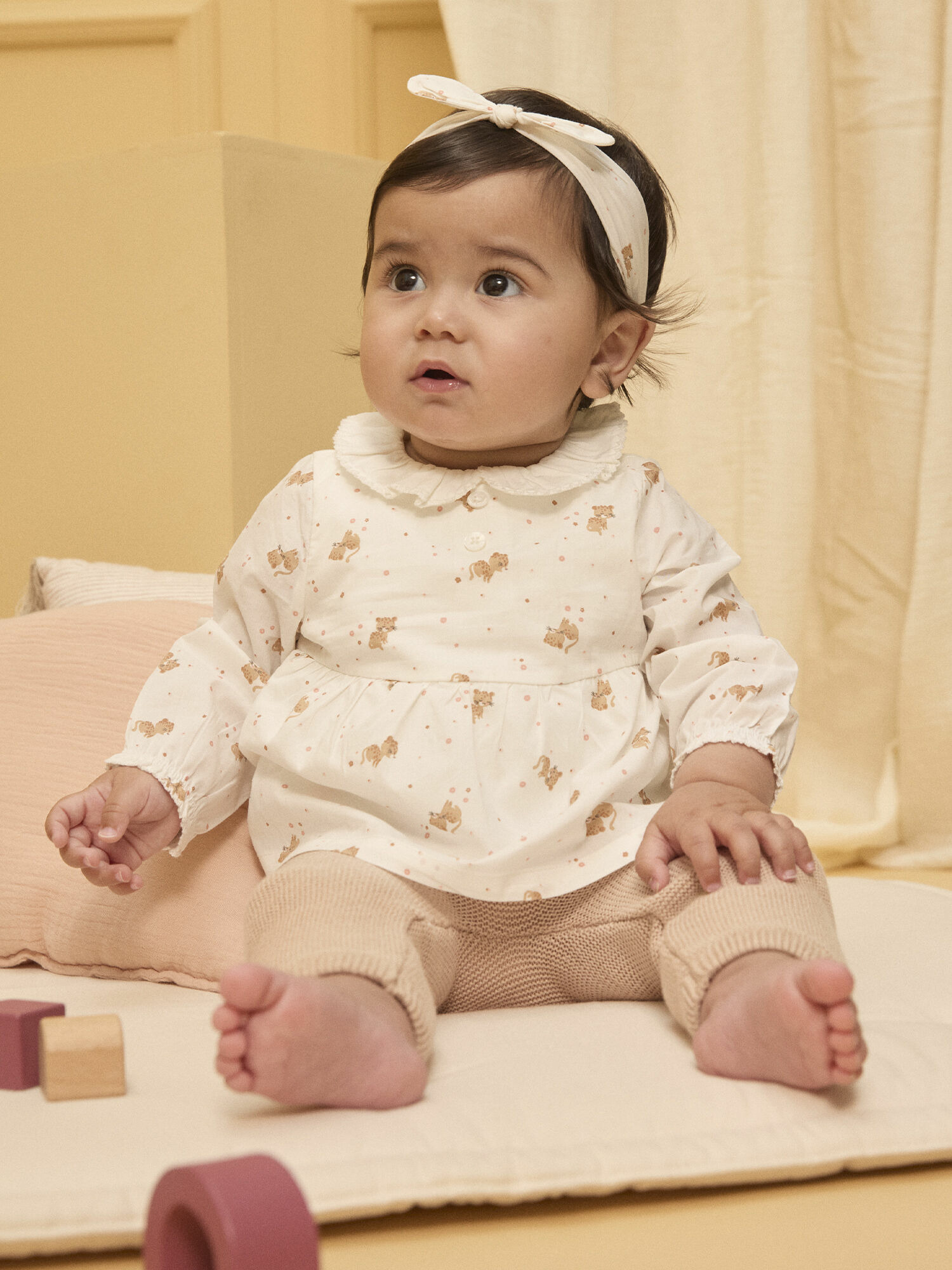 Blouse en popeline imprimée petits léopards, col rond avec finition picots, boutons en nacre gravés Sergent Major, manches élastiquées avec fronces, body intégré en côtes avec ouverture pression à l’entrejambe. Pantalon en tricot point mousse couleur biscuit rosé contenant de la laine, nœud décoratif en popeline à la taille, finitions bord côte. Bandeau en popeline assorti avec nœud décoratif et élastique à l’arrière. Vendu avec étiquette cadeau en forme de léopard. Collection Neige et douceur TR2. Référence LOUISON / 24H0CFN1ENS001.