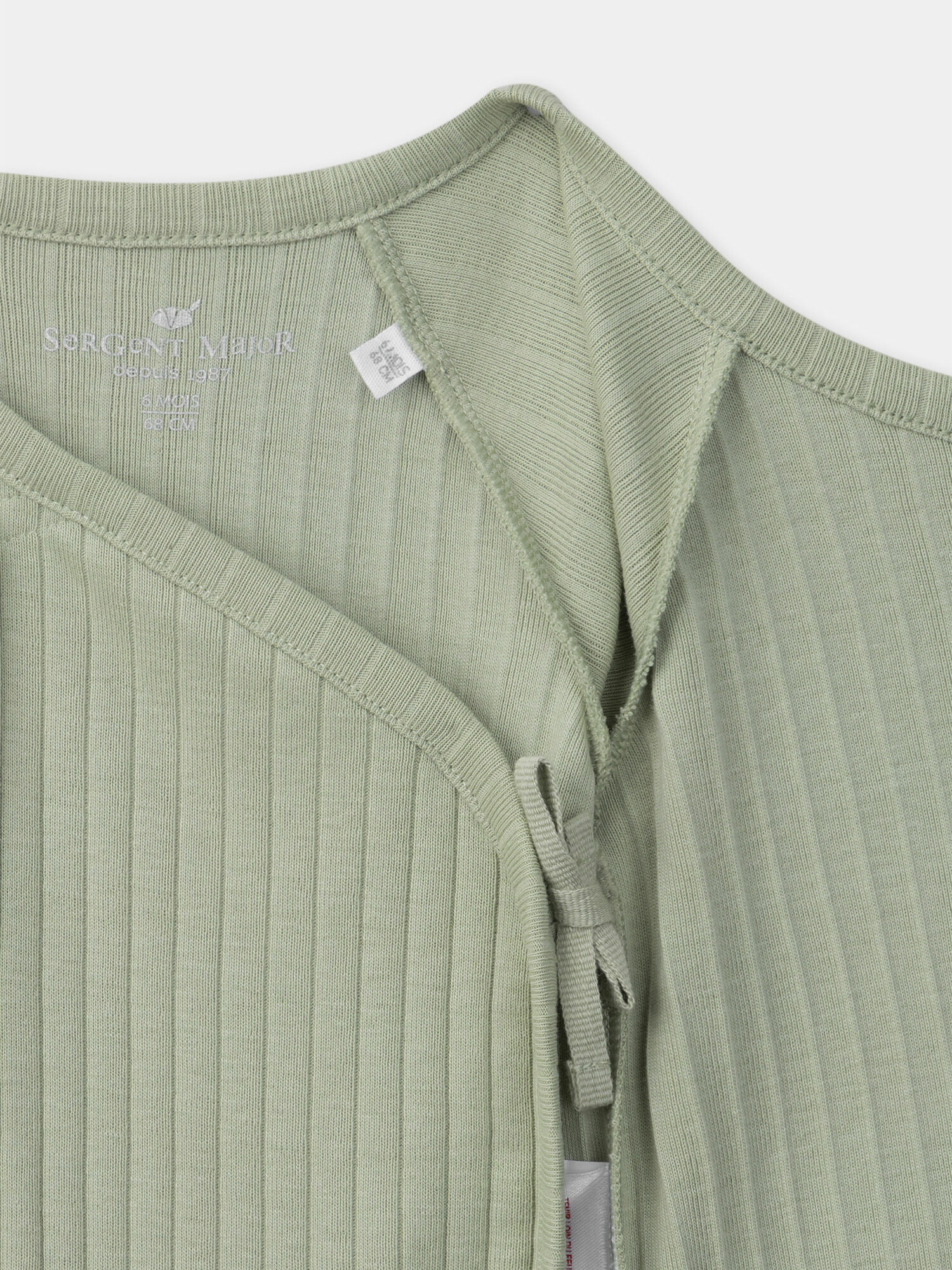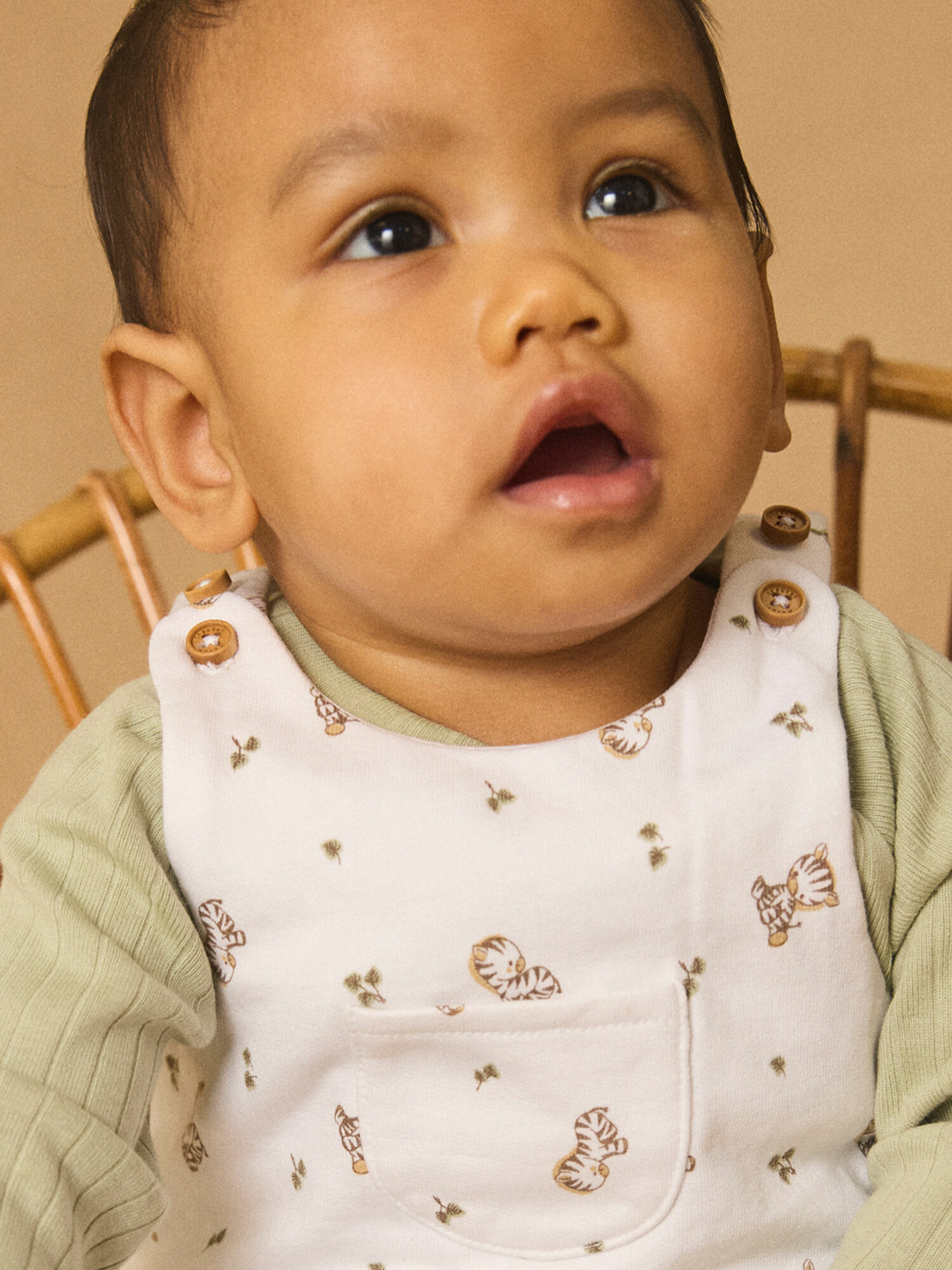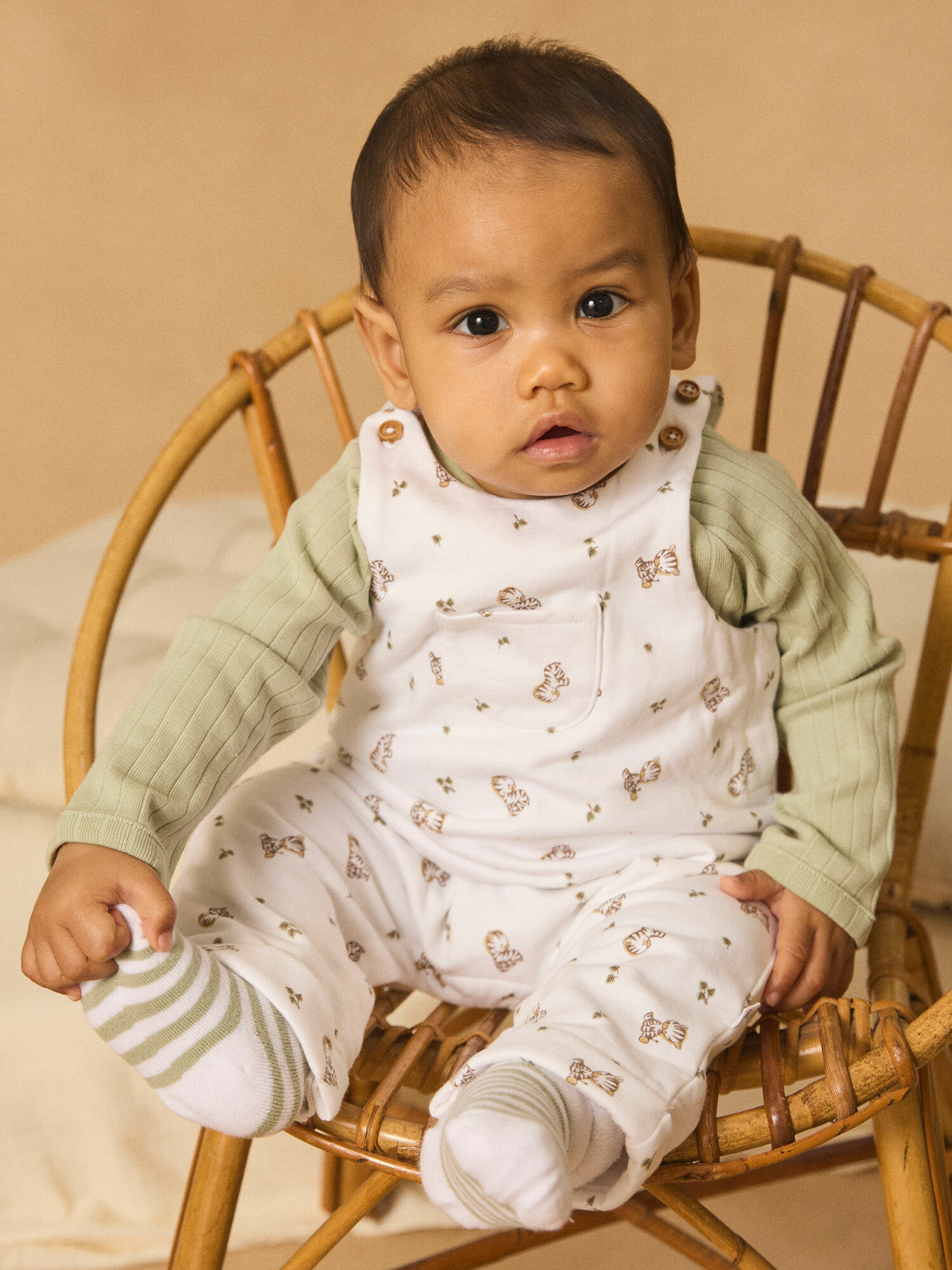 Body en côtes plates vert amande avec imprimé zèbre sur le buste. Salopette en molleton gratté avec imprimé zèbres, poche poitrine, bretelles réglables par boutons à double niveaux, ouverture par boutons pression invisibles sur les côtés et à l’entrejambe. Chaussettes en coton bouclette à rayures vert amande avec motif zèbre en jacquard. Boutons en bois naturel gravés Sergent Major. Vendu avec carte cadeau en forme de zèbre.