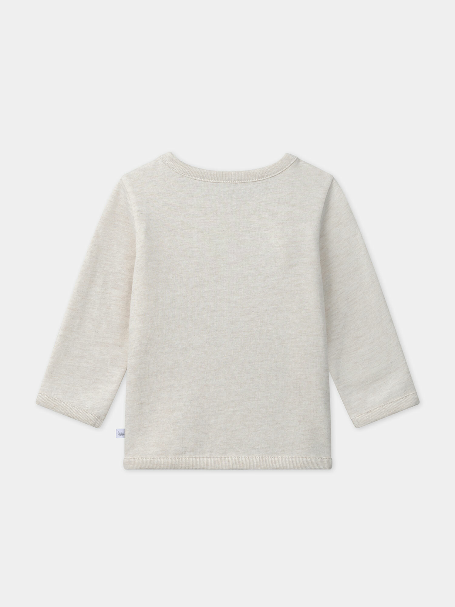 Haut en molleton gratté beige chiné clair avec patch velours zèbre et broderies. Ouverture avant arrondie par boutons pression invisibles. Pantalon legging en côtes imprimé zèbre, patte de boutonnage décorative avec boutons en bois naturel gravés. Chaussettes en coton bouclette écru avec jacquard zèbre. Taille et chevilles en côtes. Vendu avec étiquette cadeau en forme de zèbre. Collection Naissance. Référence : MORRIS / 25E0CG23ENSA011.
