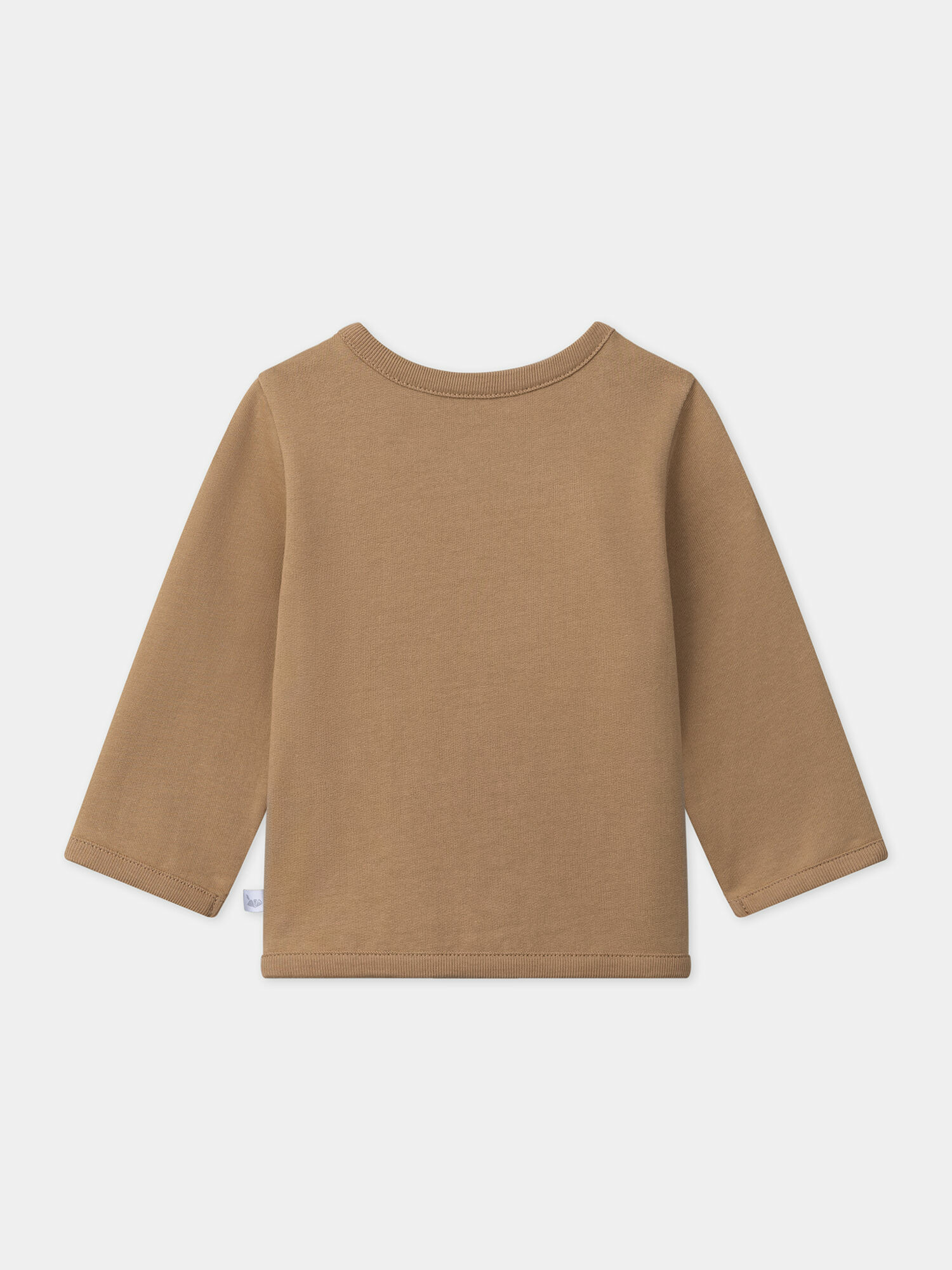 Haut : molleton gratté, manches longues, ouverture avant arrondie avec boutons pression invisibles, patch velours léopard brodé. Pantalon : style legging côtelé, imprimé tâches léopard noisette et beige foncé sur fond beige clair, 2 boutons décoratifs en bois naturel à la taille. Chaussettes : coton bouclette beige foncé, jacquard léopard noisette, miel et écru. Produit issu de la collection Naissance. Référence : MOISE / 25E0CM22ENS821.