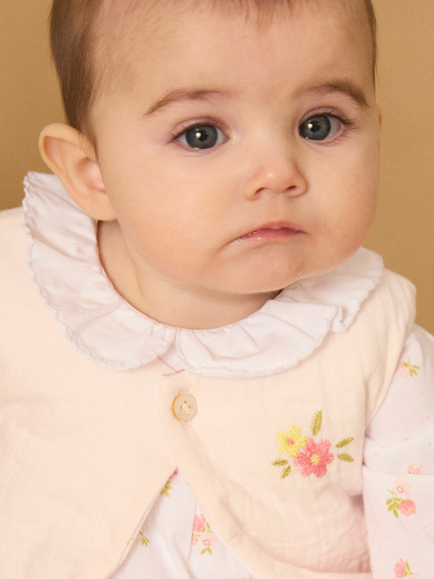 Conçu pour simplifier la vie des parents, ce trio propose des ouvertures pratiques par boutons au dos et à l’entrejambe du body, une taille souple au pantalon et une fermeture par bouton au col du gilet. Le matelassage léger du gilet garantit chaleur et douceur sans encombrement. L’imprimé fleuri et les finitions picots apportent une touche de délicatesse qui sublime chaque détail.