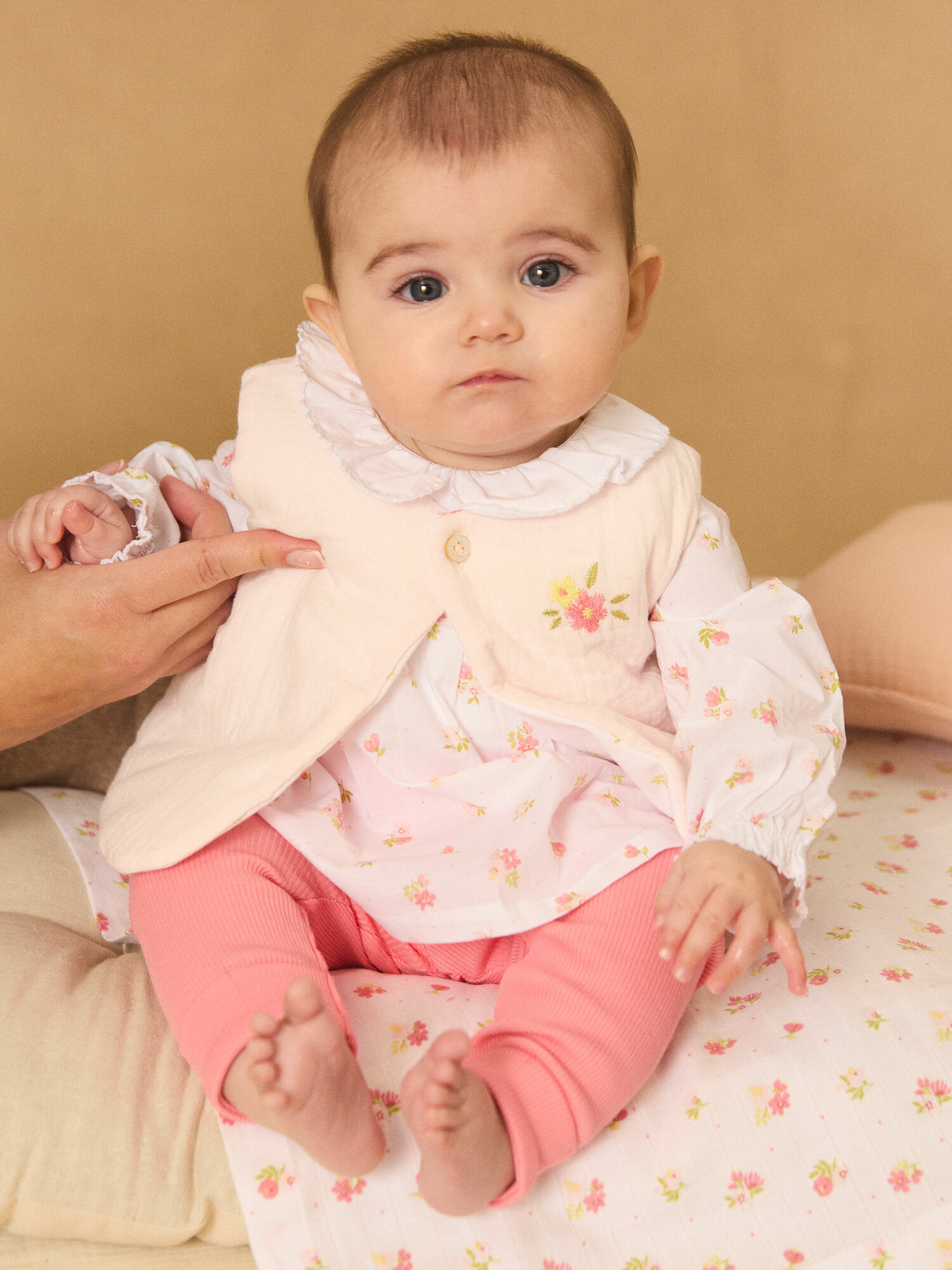 Body blouse en popeline avec body intégré en côtes, col rond et manches élastiquées à finition picots. Gilet en gaze de coton avec broderie fleur, doublure imprimée, bouton en nacre gravé et léger matelassage. Pantalon legging rose bonbon avec fausse patte de boutonnage, boutons nacre décoratifs et ourlets fixés. Produit issu de la collection Naissance. Référence : MONICA / 25E0CF21ENS000.