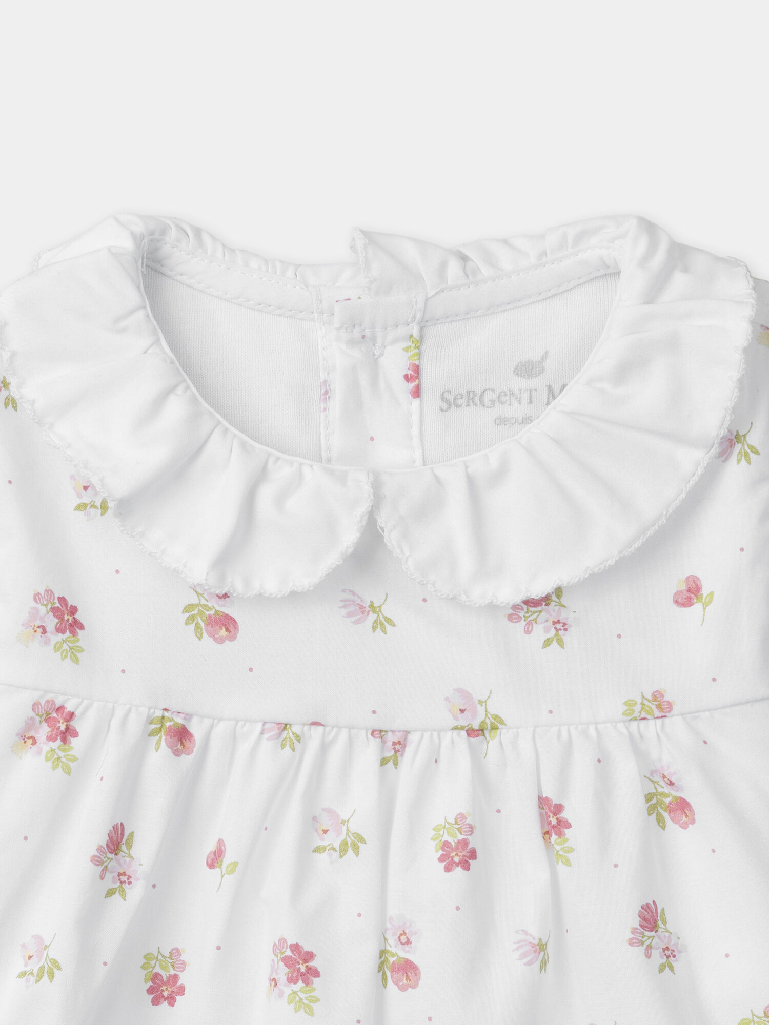 Cet ensemble associe une blouse body en popeline imprimée de fleurs délicates aux tons rose clair, rose ancien, vert anis et vert pomme sur fond écru, à un gilet sans manche en gaze de coton rose poudré orné d’une broderie florale raffinée. Le pantalon legging rose bonbon complète harmonieusement la tenue, alliant confort et esthétique. Chaque pièce est pensée pour faciliter l’habillage tout en assurant une liberté de mouvement optimale.
