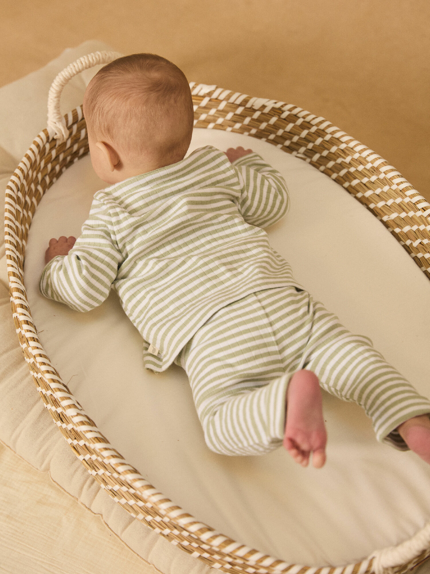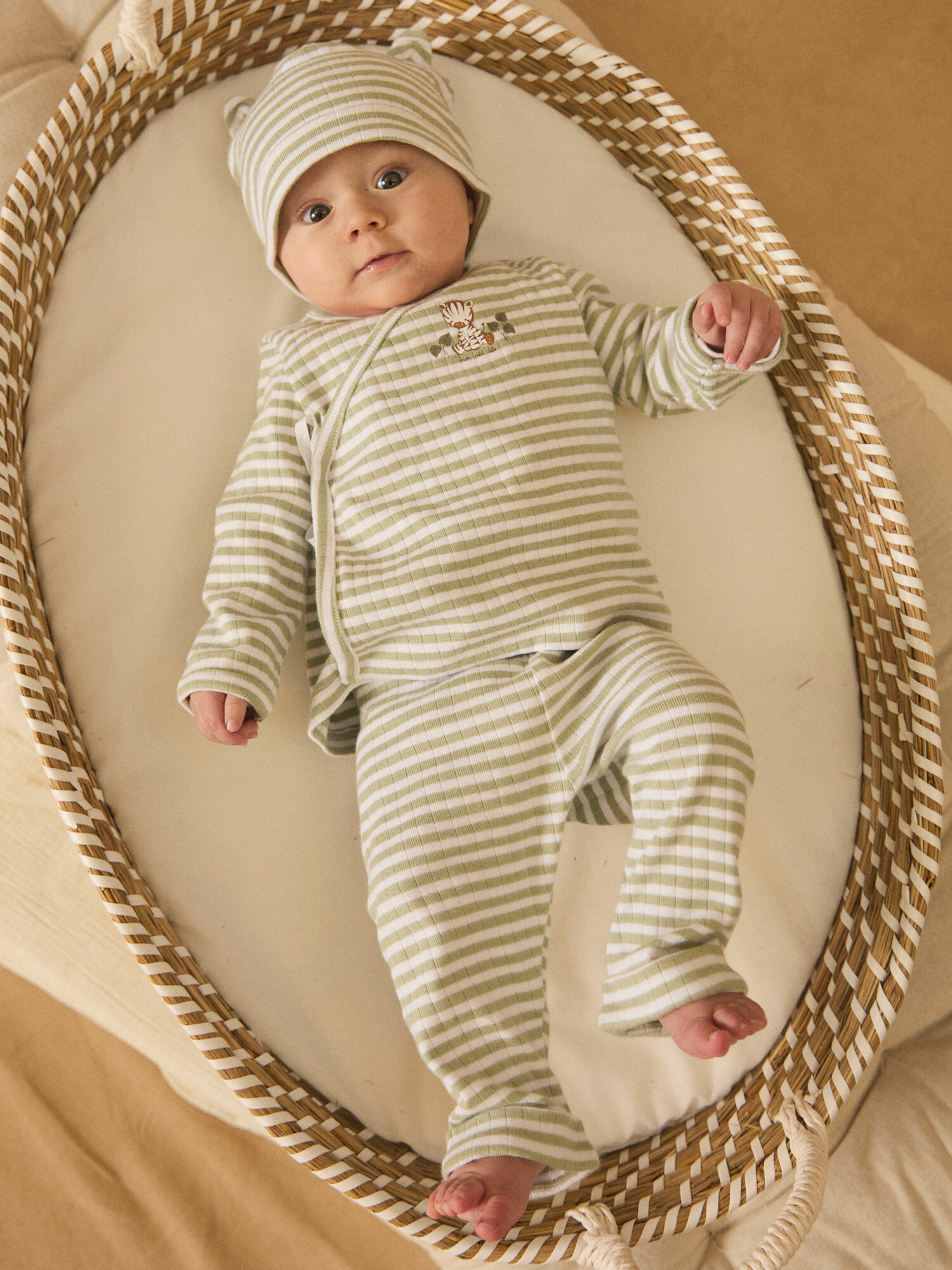 Haut brassière en côtes plates à rayures vert amande et écrues, ouverture croisée avec languette à nouer sur le côté et bouton pression intérieur. Pantalon legging assorti avec ourlets fixés. Bonnet en côtes plates avec oreilles d’animaux en 3D. Matière 100 % coton issu de l’agriculture biologique. Produit de la collection Naissance. Référence MOUSLIM / 25E0NG12ENS000.