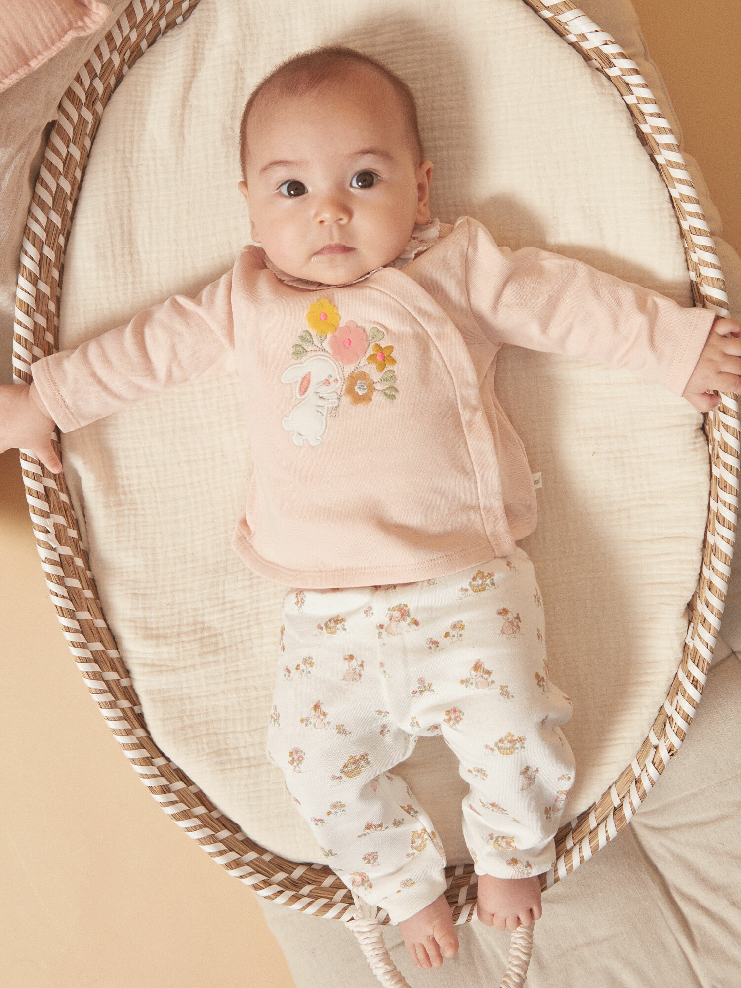 Confectionné en popeline légère, le haut se distingue par son col volanté délicat et son imprimé lapin charmant, qui apporte une touche ludique à la tenue. Les manches longues et l’ouverture à boutons-pression croisés facilitent l’habillage tout en assurant un maintien optimal. Le pantalon assorti, doté d’une taille élastiquée, garantit confort et liberté de mouvement pour votre nouveau-né.