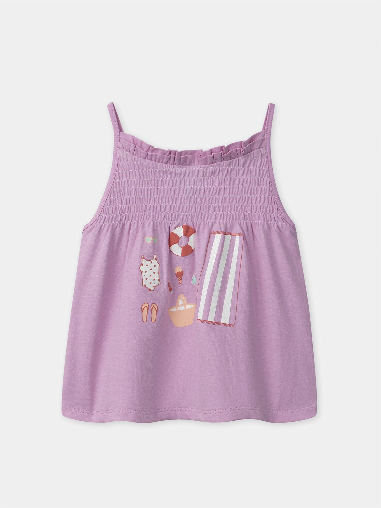 Le top rose à imprimé Plage séduit par son smock délicat sur le devant et ses fines bretelles, offrant une silhouette légère et féminine. Le short rayé, orné de motifs coraux, propose une coupe large effet jupe qui garantit une liberté de mouvement optimale. Ensemble, ils incarnent la douceur et la fraîcheur indispensables à vos escapades estivales.