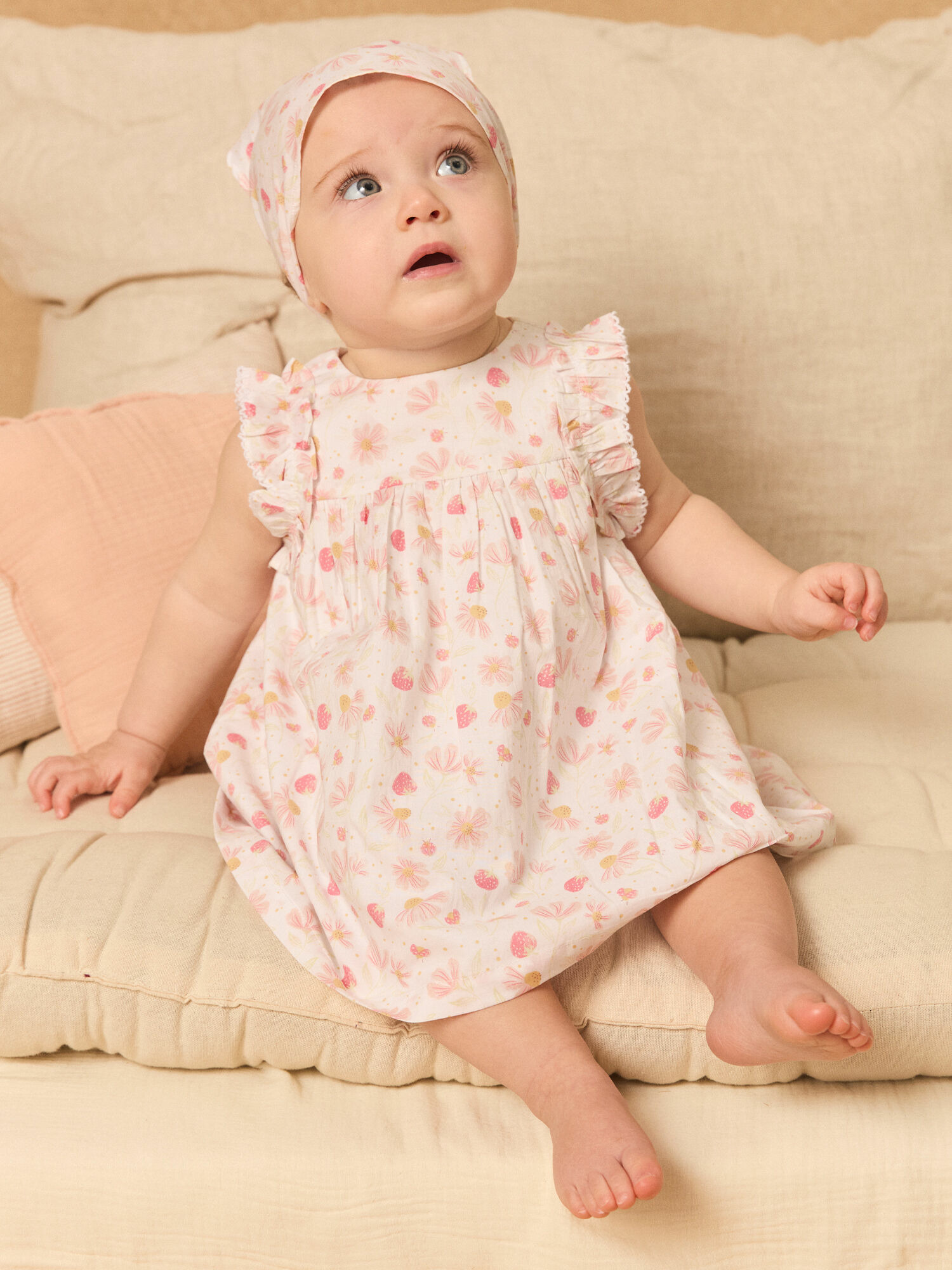 La robe séduit par son imprimé fraises et fleurs dans des tons subtils de rose pâle, framboise, ocre et vert anisé sur un fond écru lumineux. Ses emmanchures volantées et les finitions en picots apportent une touche raffinée, tandis que la doublure en voile de coton garantit confort et légèreté. Le bloomer en popeline assorti complète ce look champêtre avec un imprimé identique, offrant liberté de mouvement et style. Le bandeau style bandana, élastiqué pour un maintien optimal, ajoute une note charmante et pratique.