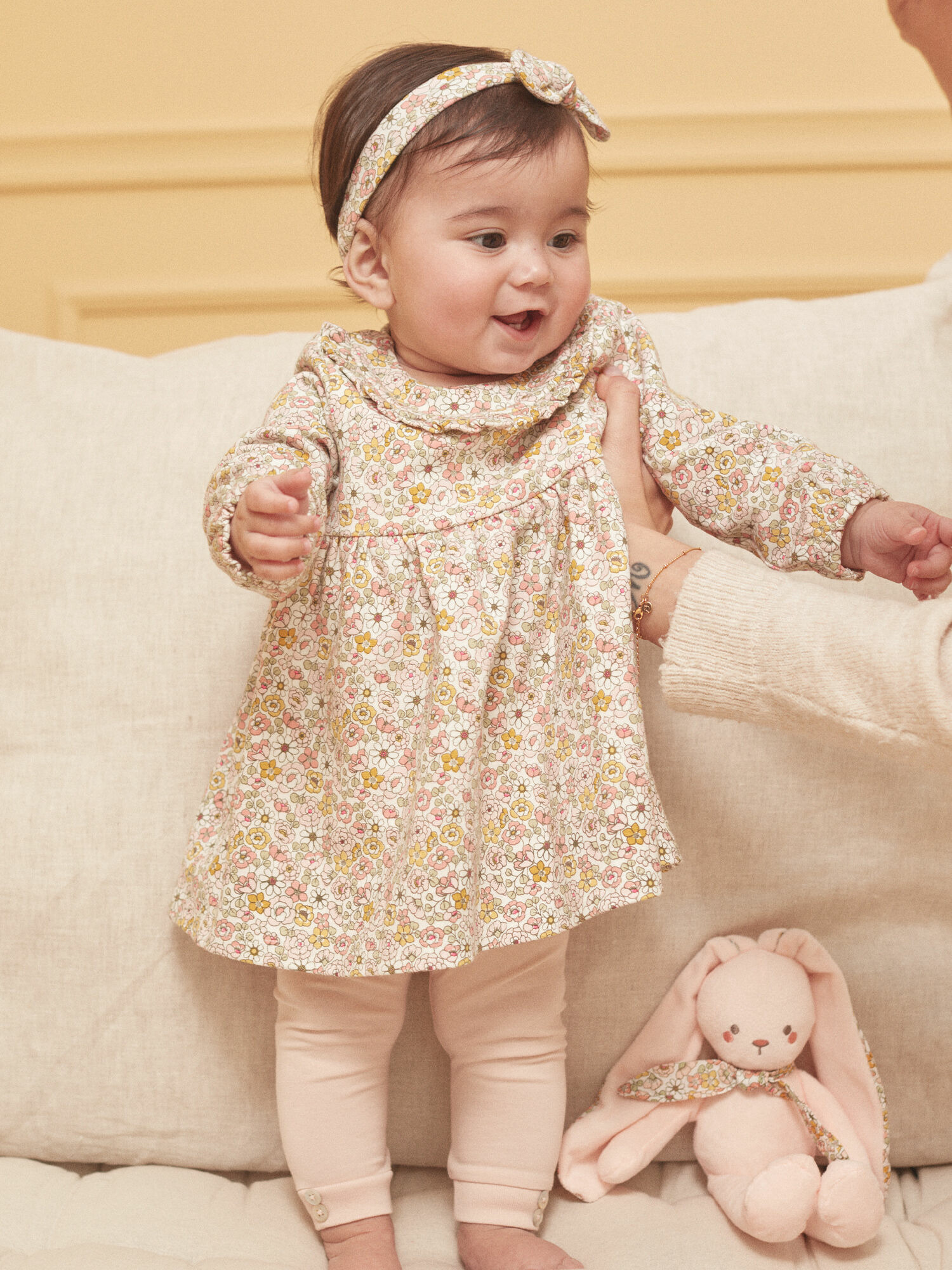 L’ensemble fait partie de la Collection Naissance - Forêt Enchantée, reflétant un univers naturel et poétique. Référence LOENIE / 24H0CF13ENS001. La robe présente un col Claudine, manches longues et ouverture à boutons au dos. Le pantalon est un legging à taille élastiquée. Le bandeau assorti arbore un imprimé fleuri et un nœud devant.
