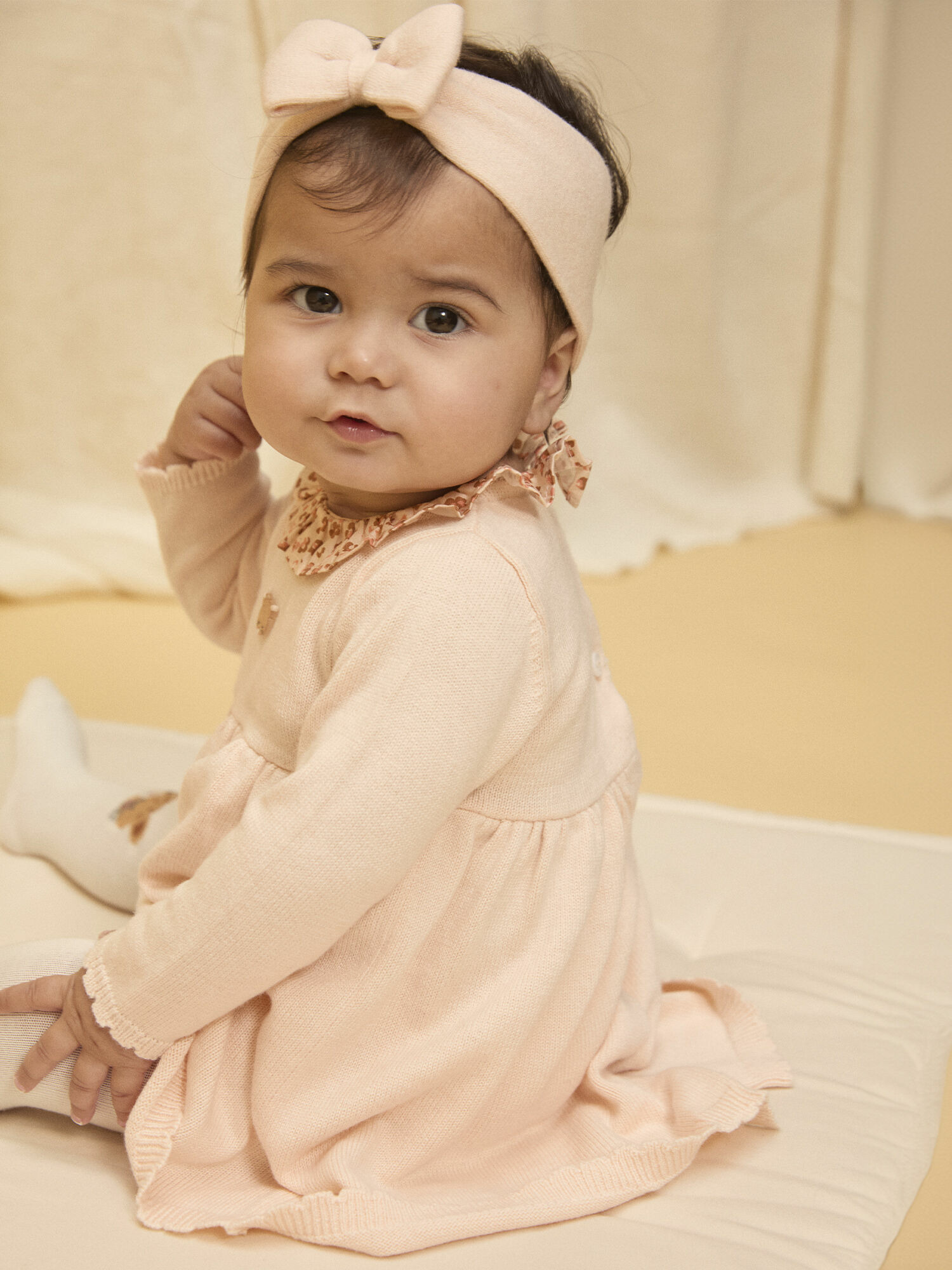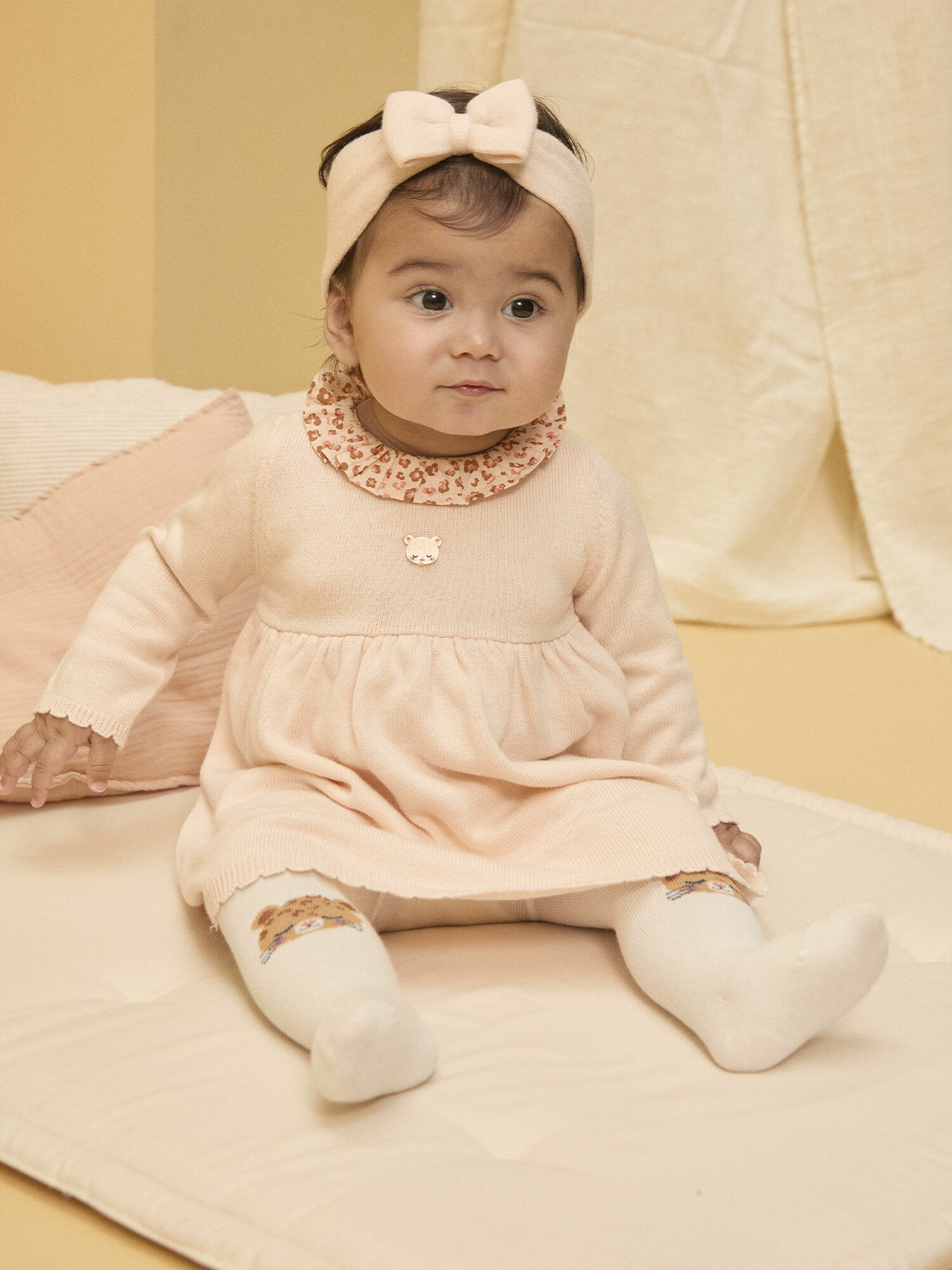 La robe en tricot point jersey rose clair séduit par son col volanté orné d’un imprimé floral inspiré des tâches de léopard, dans des nuances caramel et rose sur fond pâle. Un badge en résine léopard délicatement posé sur le buste apporte une touche unique, tandis que les fronces et les finitions en côtes avec découpe en coquille aux manches et à la base renforcent son charme délicat. Le bandeau assorti avec nœud décoratif et les collants écrus à côtes, rehaussés d’un jacquard léopard aux genoux, complètent cet ensemble harmonieux, parfait pour les petites fashionistas.