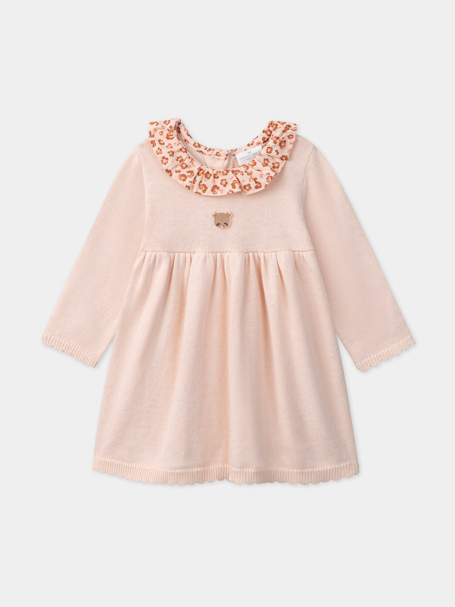 Robe en tricot point jersey rose clair avec col volanté imprimé fleurs léopard caramel et rose sur fond rose pâle. Badge en résine léopard beige rosé sur le buste. Fronces au buste, bas des manches et de la robe en côtes avec découpe en coquille. Boutons nacrés gravés Sergent Major au dos. Bandeau tricot rose clair avec nœud décoratif. Collants écrus à côtes avec jacquard léopard caramel aux genoux. Vendu avec étiquette cadeau en forme de léopard. Collection Neige et douceur TR2. Référence LODIA / 24H0CFN2ENSD322.