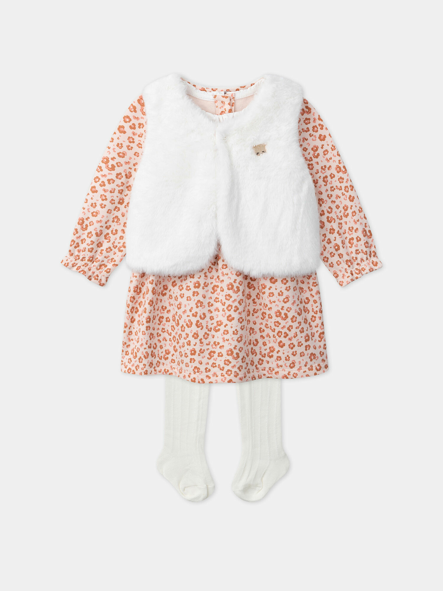 Robe en molleton gratté avec imprimé fleurs inspiré des tâches de léopard dans les tons caramel et rose sur fond rose pâle. Deux boutons décoratifs en nacre gravés "Sergent Major" sous le col, manches élastiquées et froncées, fermeture dos par boutons nacre. Col rond en popeline écrue avec finition picots. Gilet en fourrure synthétique écrue, badge en résine léopard beige rosé, doublure jersey écru imprimé assorti, fermeture avant par bouton nacre. Collants écrus à côtes avec jeux de points ajourés. Étiquette cadeau léopard incluse. Collection Neige et douceur TR2. Référence LOUISE / 24H0CFN3ENSD322.