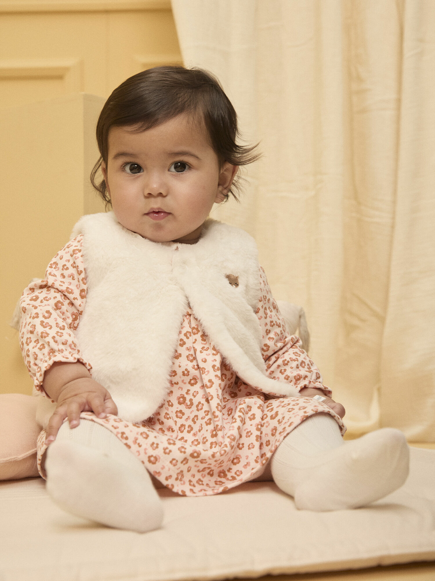 La robe en molleton gratté séduit par son imprimé floral inspiré des tâches de léopard, mêlant caramel et rose sur un fond rose pâle, rehaussée de boutons en nacre gravés "Sergent Major". Son col rond en popeline écrue et ses manches élastiquées apportent une finition délicate et confortable. Le gilet en fourrure synthétique écrue, doublé d’un jersey assorti à la robe, offre chaleur et raffinement, souligné par un badge en résine léopard beige rosé. Les collants écrus à côtes, ponctués de points ajourés, complètent cet ensemble avec une touche de finesse.