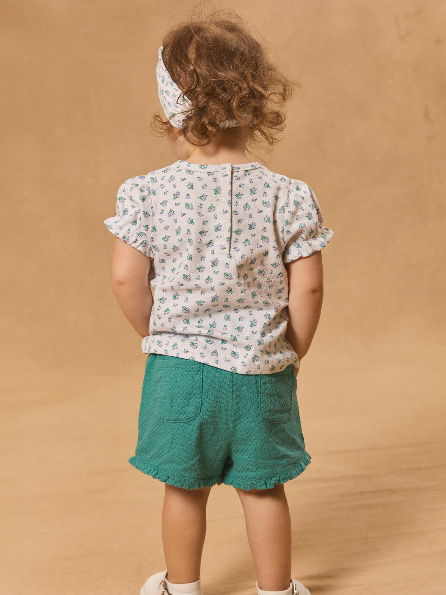 Le t-shirt écru se pare d’un imprimé fleuri mauve et vert, sublimé par des manches ballon élastiquées qui apportent légèreté et liberté de mouvement. Le short vert turquoise, orné de volants délicats sur le bas des cuisses, se règle facilement grâce à son cordon fleuri, tandis que ses poches avant et arrière offrent praticité au quotidien. Le bandeau assorti, croisé à l’avant et élastiqué à l’arrière, complète l’ensemble avec une touche raffinée et un maintien optimal.