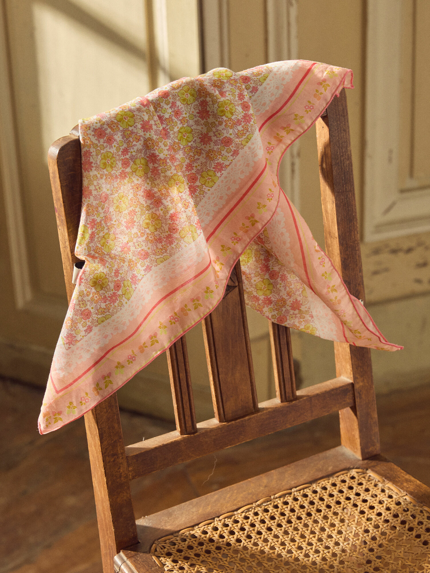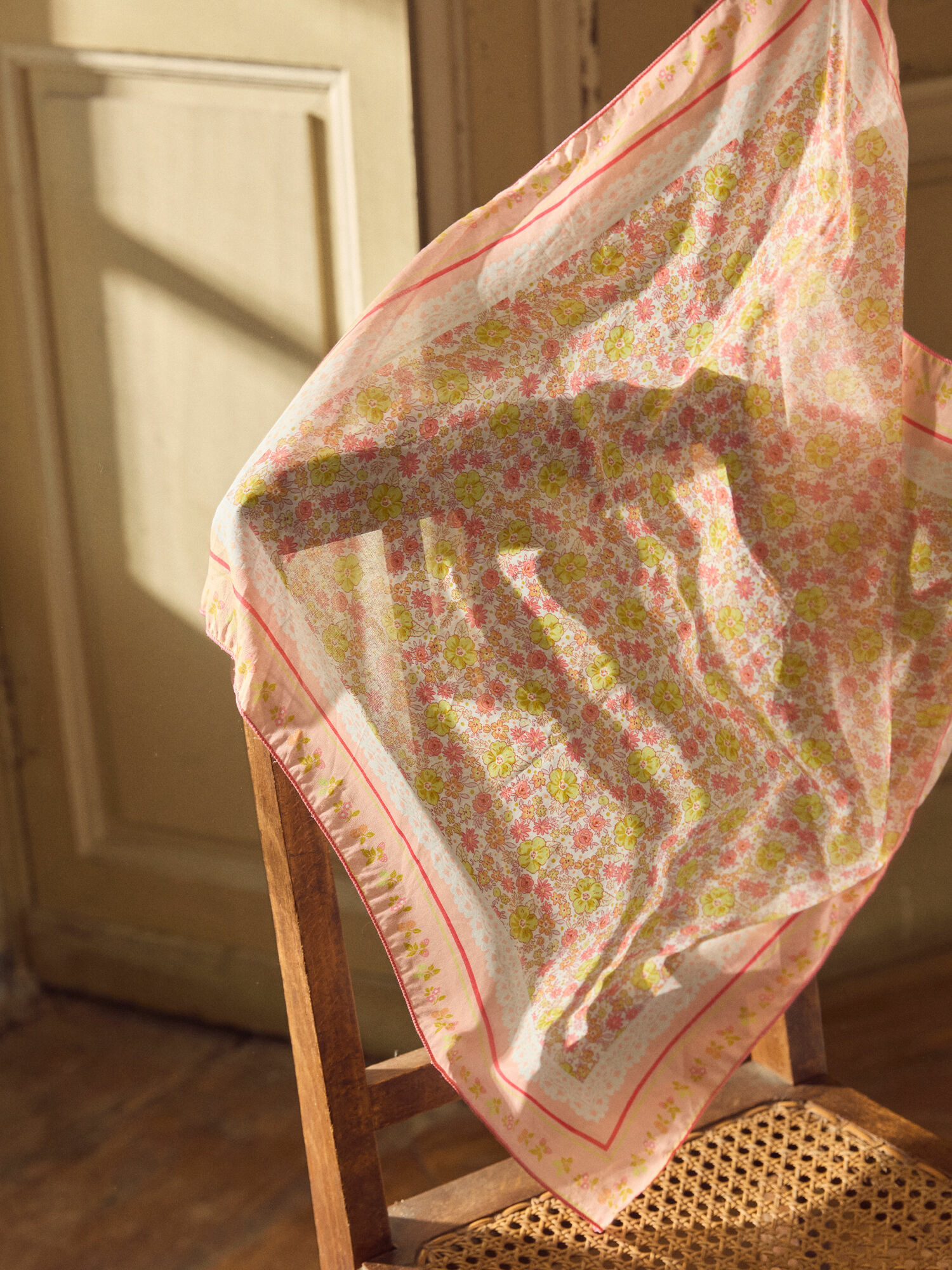 Dimensions : 50x50 cm. Foulard carré imprimé fleurs dans les tons rose et jaune. Impression dentelle sur le tour. Contour avec frise imprimée aux lignes roses et jaunes. Finition points bourdon rose. Collection Jaune de Tournesol. Référence : MLAFOLETTE / 25E4PFK1ECH301.