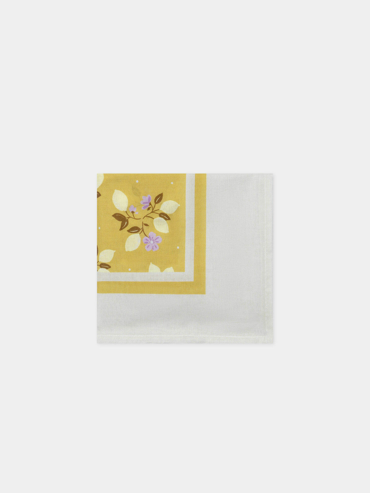 Ce foulard Sergent Major mêle agrumes et fleurs dans un imprimé champêtre aux tons chauds méditerranéens, rehaussé d’une large bordure couleur sable. Sa matière en coton léger offre une texture douce et agréable, parfaite pour vous accompagner du matin au soir, noué sur la tête, autour du cou ou même au poignet. Son design évoque un week-end en Provence, invitant à la détente et à l’élégance simple.