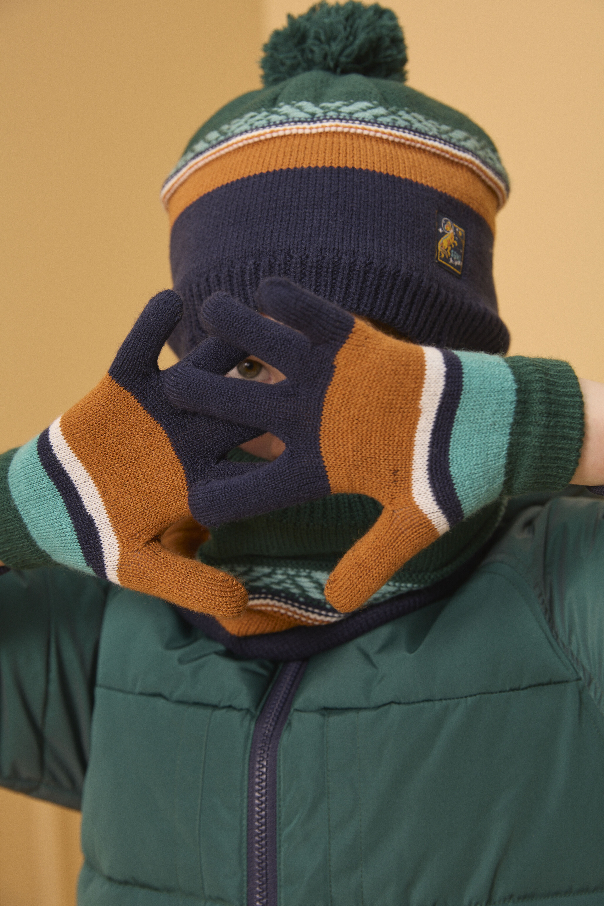 Ces gants en maille signés Sergent Major sont conçus pour accompagner les petites mains curieuses lors des journées fraîches. Leur design ludique, ponctué de jeux de points colorés et d’une étiquette dinosaure tissée, apporte une touche d’originalité à chaque sortie.
