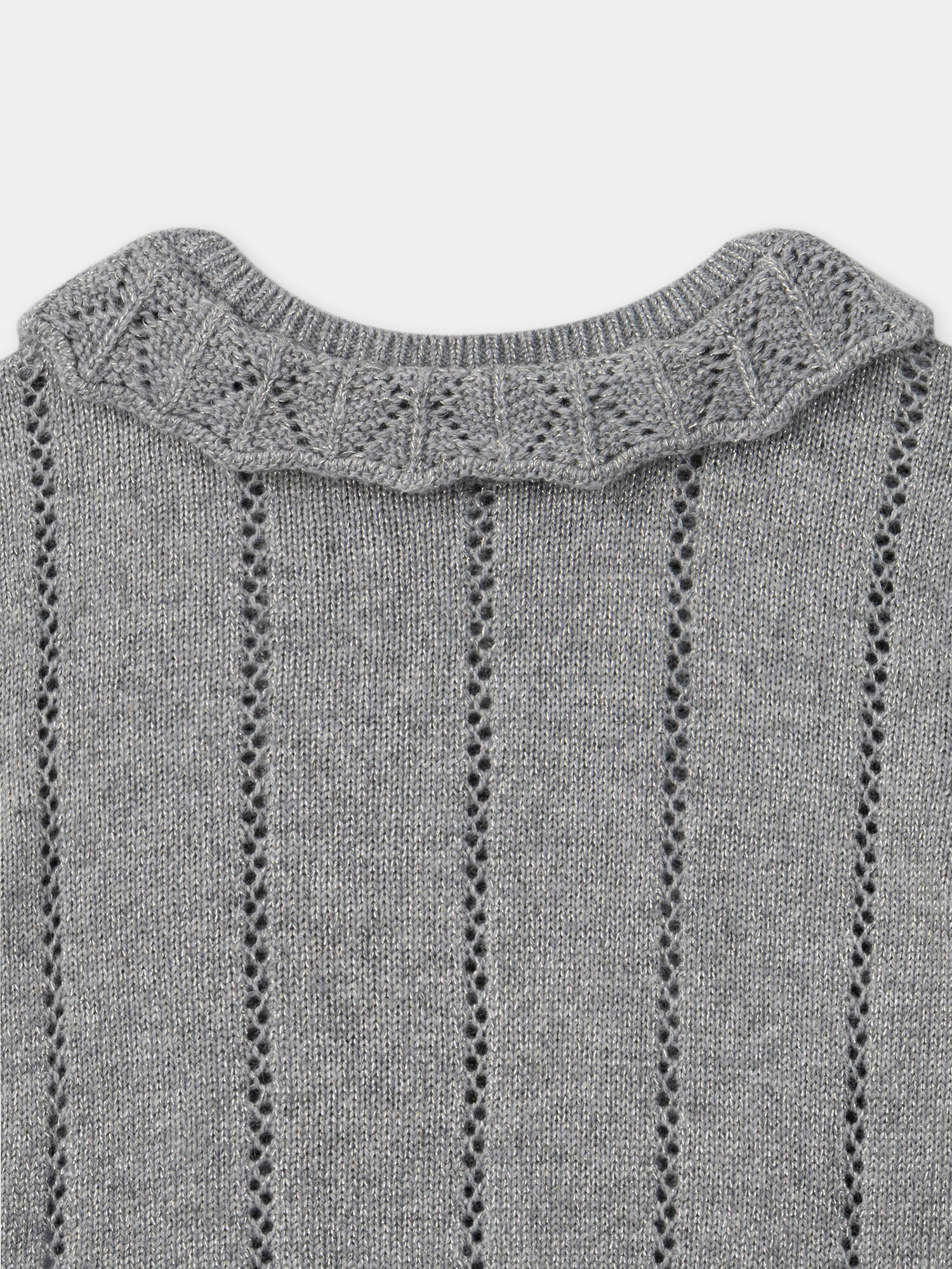 Ce gilet argenté ajouré sublime chaque tenue avec une touche d’élégance discrète. Ses mini volants délicats et ses détails ajourés révèlent un style raffiné et féminin.