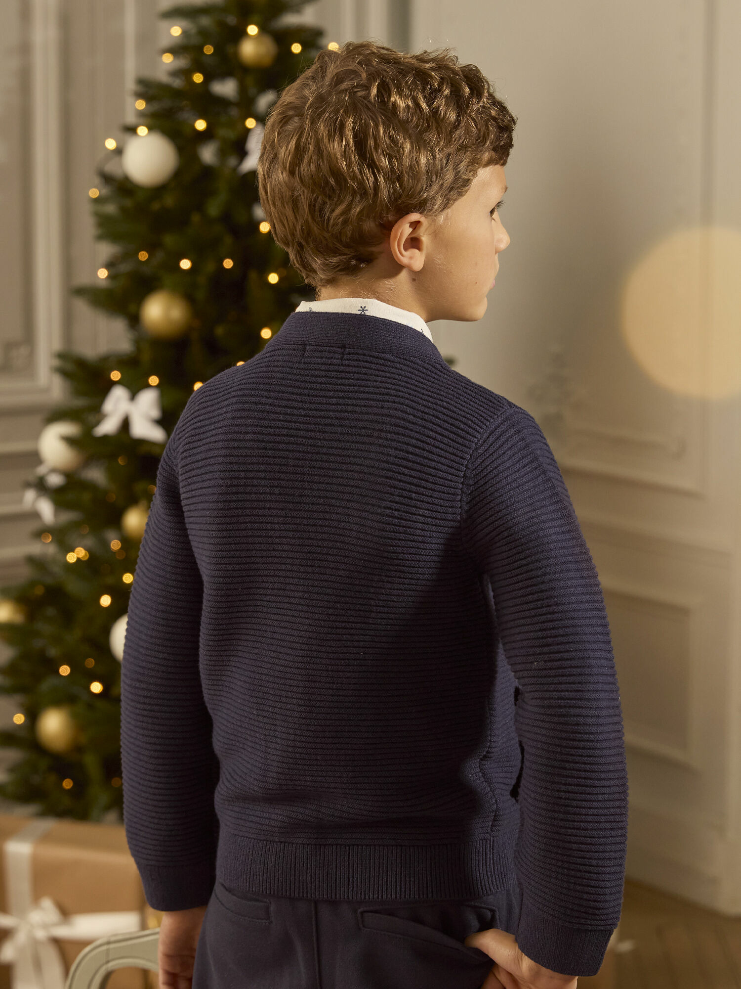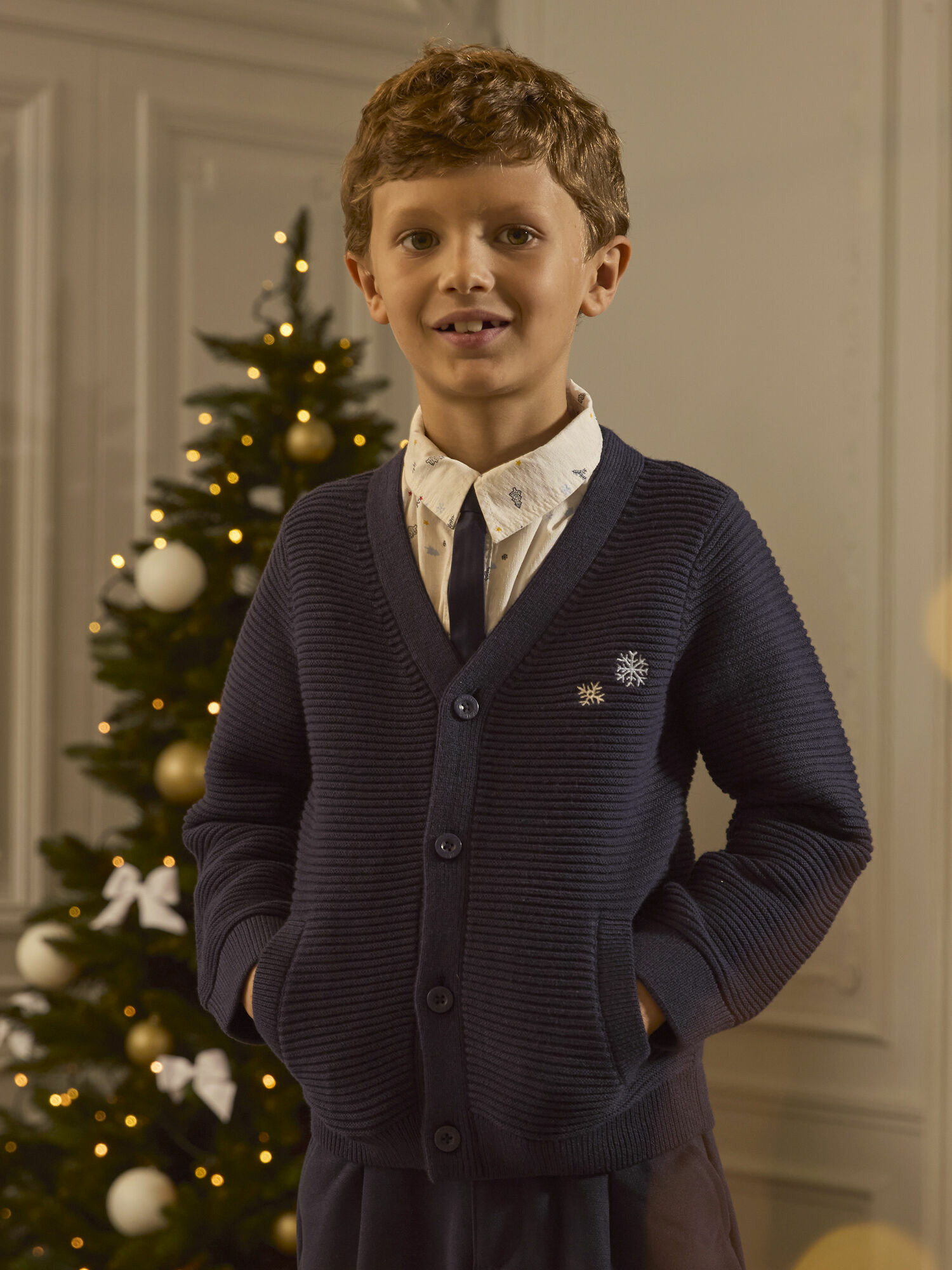 Broderie flocons sur la poitrine, deux poches avant, bord-côte au col, poignets et taille, ouverture boutonnée sur l’avant. Ce modèle fait partie de la collection Papillotes en Laponie, référence LEDILAGE / 24H3PGT1GILC205.