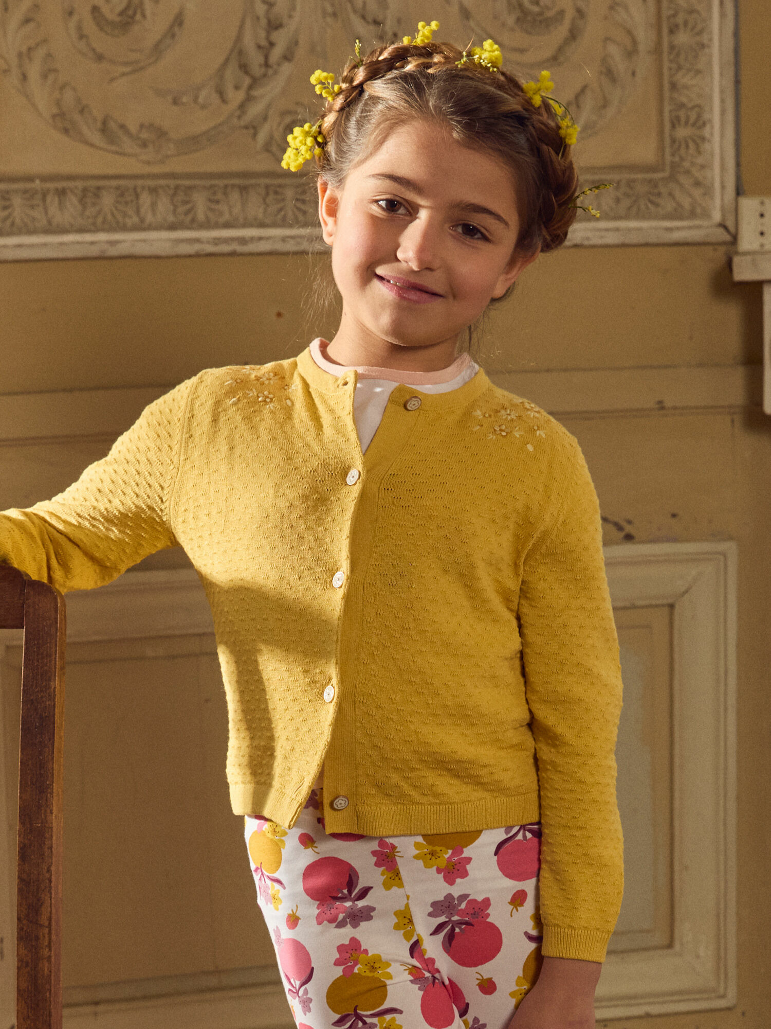 Ce gilet se distingue par ses broderies délicates de fleurs et ses boutons en forme de fleurs, qui insufflent une note subtilement florale à chaque tenue. Sa coupe souple garantit une liberté de mouvement idéale pour les jeux et les aventures du quotidien, tandis que sa matière légère convient parfaitement aux températures du printemps.